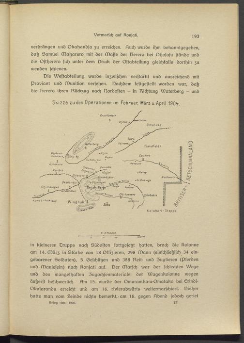 in kleineren Drupps nach Südostsn fortgesetzt halten, brach die Kolonne am 14. März in Stärke von 18 Offizieren, 298 Mann (einschließlich 34 eingeborener Soldaten), 5 Geschützen und 388 Nsit- und Zugtieren (Pferden und Mauleseln) nach ßonjati auf. Der Marsch war der schlechten Wege und des mangelhaften Zugochsenmatsrials der Wagenkolonne wegen äußerst beschwerlich, sslm 15. wurde der Omuramba-u-Omatako bei Crindi- Okasarandu erreicht und am 1b. rivierabwärts weitermarschierl. Bisher hatte man vom §einde nichts bemerkt, am Ib. gegen Albsnd jedoch geriet