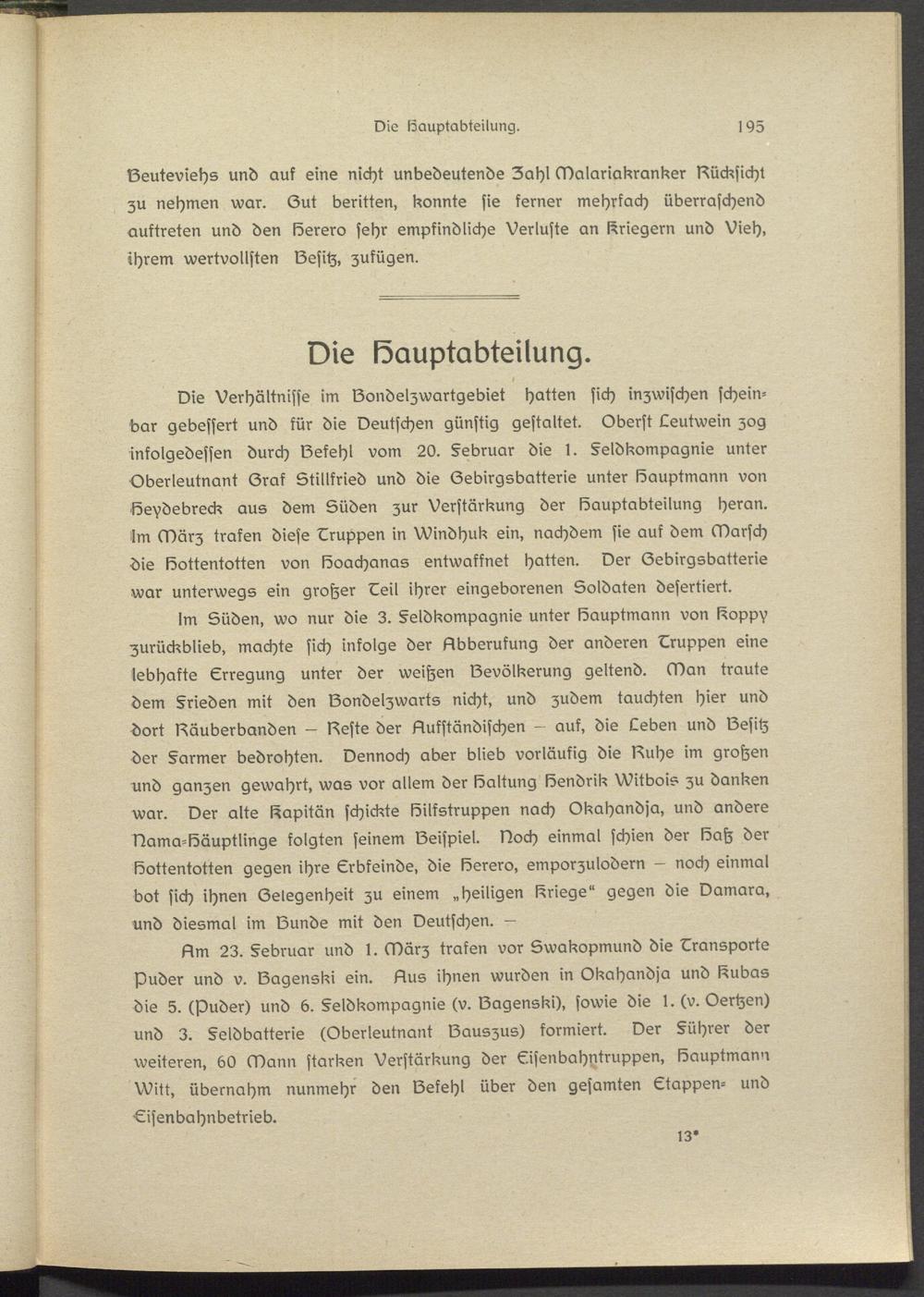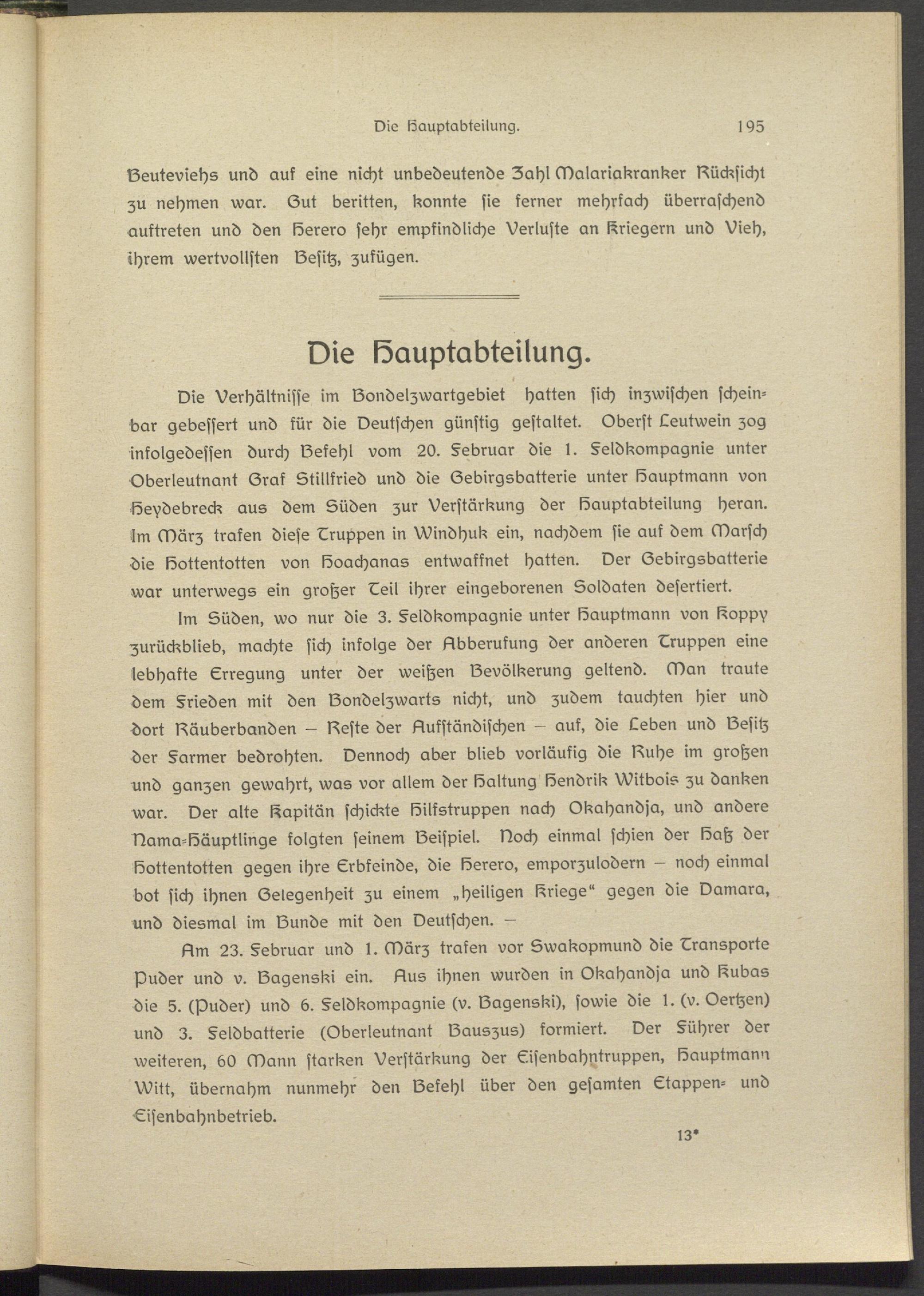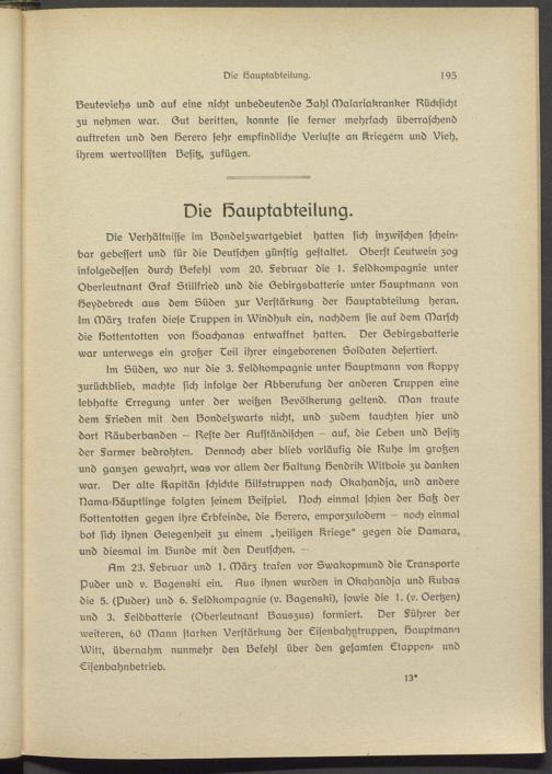 Beuteviehs und auf eins nicht unbedeutende Zahl Malariakranker Rücksicht zu nehmen war. Out beritten, konnte sie ferner mehrfach überraschend auftreten und den Berero sehr empfindliche Verluste an Kriegern und Vieh, ihrem wertvollsten Besitz, zufügen.