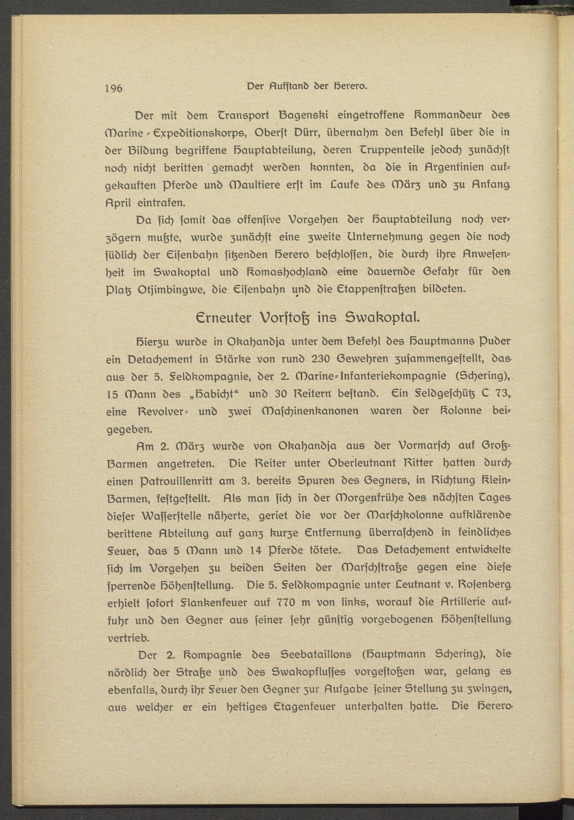 Da sich somit das offensive Vorgehen der Hauptabteilung noch verzögern muhte, wurde zunächst eine zweite Unternehmung gegen die noch südlich der Eisenbahn sitzenden Hsrero beschlossen, die durch ihre Anwesenheit im Swakoptal und ßomashochland eine dauernde Oekahr für den Platz Otjimbingwe, die Eisenbahn und die Etappenstrahen bildeten.