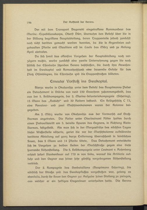 Der 2. Compagnie des Seebataillons (Hauptmann Schering), die nördlich der Strahe und des Swakopklusses vorgestohen war, gelang es ebenfalls, durch ihr Feuer den Oegner zur Aufgabe seiner Stellung zu zwingen, aus welcher er ein heftiges Etagenkeuer unterhalten hatte. Oie Herero-