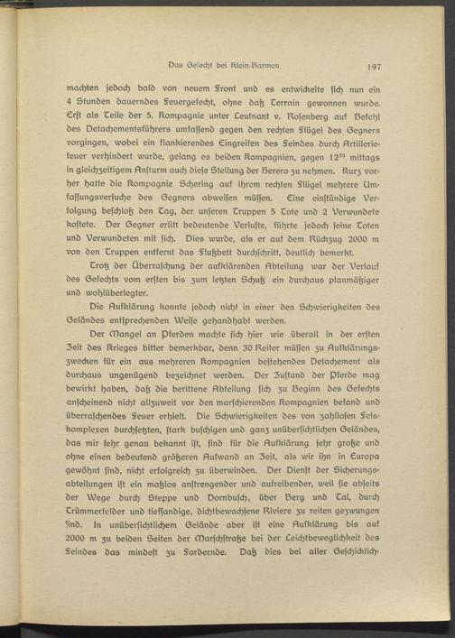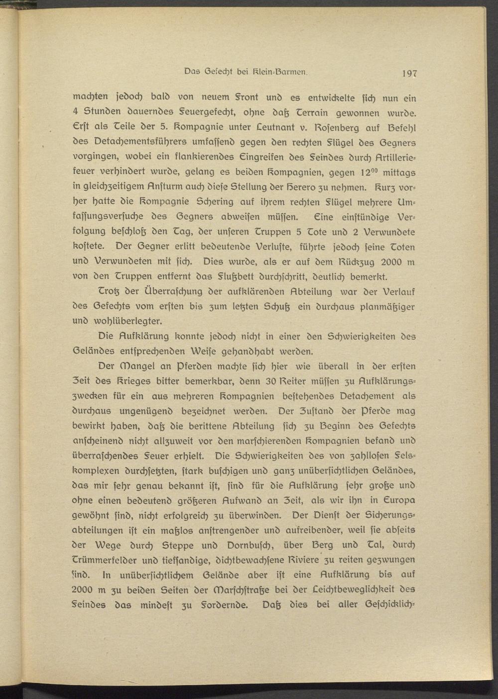 Der Mangel an Pferden machte sich hier wie überall in der ersten Zeit des Krieges bitter bemerkbar, denn 30 Aeiter müssen zu Aufklärungszwecken kür ein aus mehreren Compagnien bestehendes Dstachement als durchaus ungenügend bezeichnet werden. Der Zustand der Pferde mag bewirkt haben, daß die berittene Abteilung sich zu lZeginn des Gefechts anscheinend nicht allzuweit vor den marschierenden Compagnien befand und überraschendes §susr erhielt. Die Schwierigkeiten des von zahllosen §els- komplexen durchsetzten, stark buschigen und ganz unübersichtlichen Geländes, das mir sehr genau bekannt ist, sind kür die Aufklärung sehr große und ohne einen bedeutend größeren Aufwand an Zeit, als wir ihn in Europa gewöhnt sind, nicht erfolgreich zu überwinden. Der Dienst der Sicherungs- abtsilungen ist ein maßlos anstrengender und aufreibender, weil sie abseits der XVegs durch Steppe und Dornbusch, über lZerg und Dal, durch Drümmerkeldsr und tiefsandige, dichtbswachsene Aiviere zu reiten gezwungen sind. In unübersichtlichem Gelände aber ist eins Aufklärung bis auf 2000 m zu beiden Seiten der Marschstraße bei der Leichtbeweglichkeit des §eindes das mindest zu §ordernde. Daß dies bei aller Geschicklich-