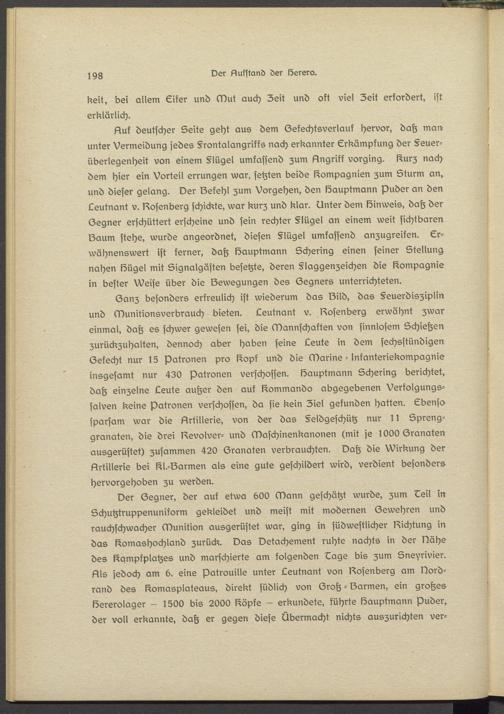 Huf deutscher Seite geht aus dem Gskechtsvsrlauf hervor, datz man unter Vermeidung jedes Frontalangriffs nach erkannter Erkämpfung der §susr- übsrlegenheit von einem Flügel umfassend zum Hngriff vorging, k^urz nach dem hier ein Vorteil errungen war, setzten beide Compagnien zum Sturm an, und dieser gelang. Der lZskehl zum Vorgehen, den Sauptmann Puder an den Leutnant v. Sossnbsrg schickte, war kurz und klar. Unter dem löinwsis, dah der Gegner erschüttert erscheine und sein rechter Flügel an einem weit sichtbaren Saum stehe, wurde angeordnet, diesen Flügel umfassend anzugreifen. Erwähnenswert ist ferner, datz läauptmann Schering einen seiner Stellung nahen löügel mit Signalgästen besetzte, deren Flaggenzeichsn die Compagnie in bester Weiss über die lZswegungen des (Zegners unterrichteten.