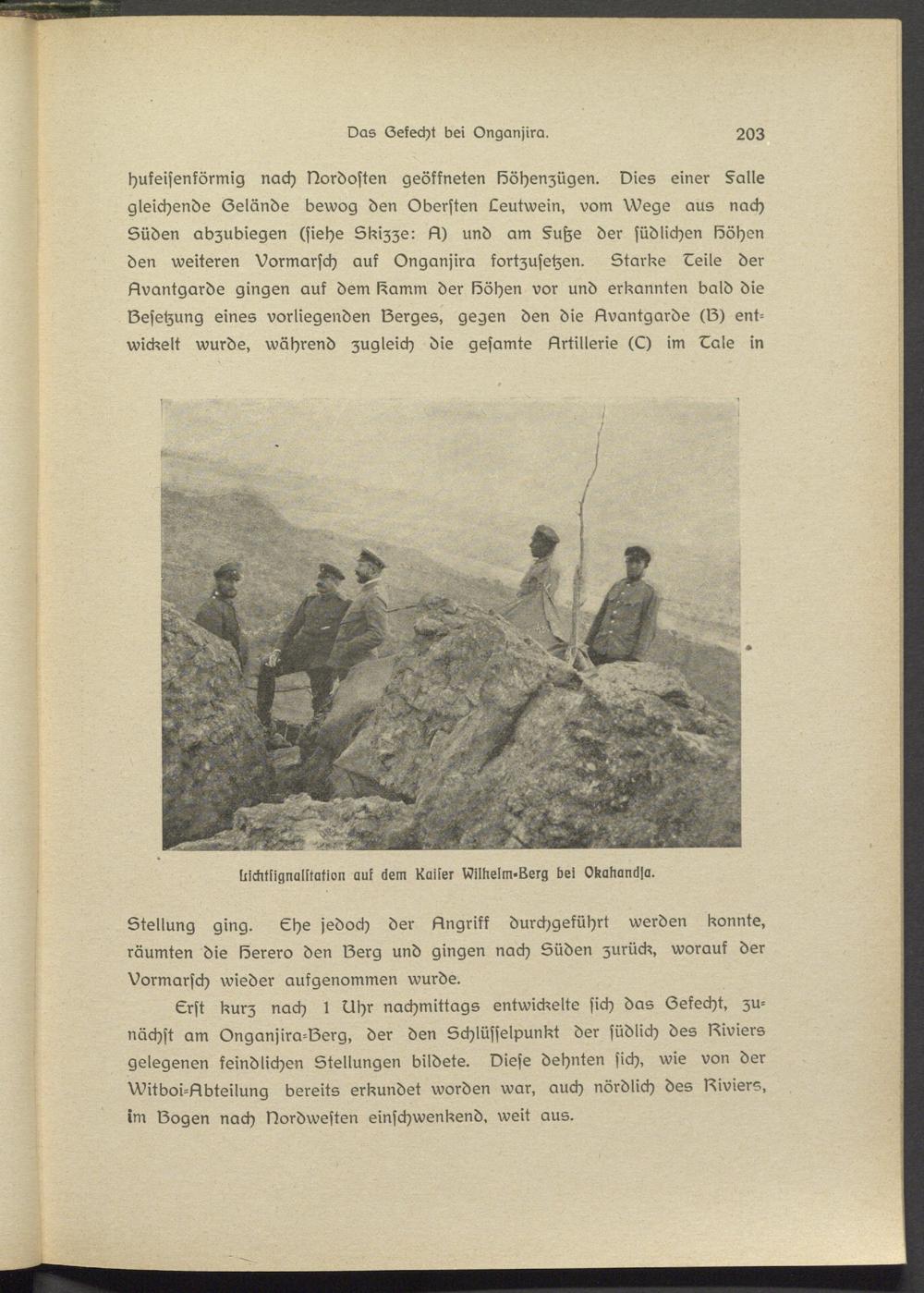 hufeisenförmig nach Nordosten geöffneten Söhenzügen. Dies einer §alle gleichende Oelände bewog den Obersten Leutwsin, vom Wegs aus nach Süden abzubiegen (siehe Skizze: A) und am §utzs der südlichen Sähen den weiteren Vormarsch auk Onganjira fortzusetzen. Starke Dells der Avantgarde gingen auf dem Samm der Sähen vor und erkannten bald die Sssetzung eines vorliegenden IZerges, gegen den die Avantgarde (lZ) entwickelt wurde, während zugleich die gesamte Artillerie (C) im Dale in