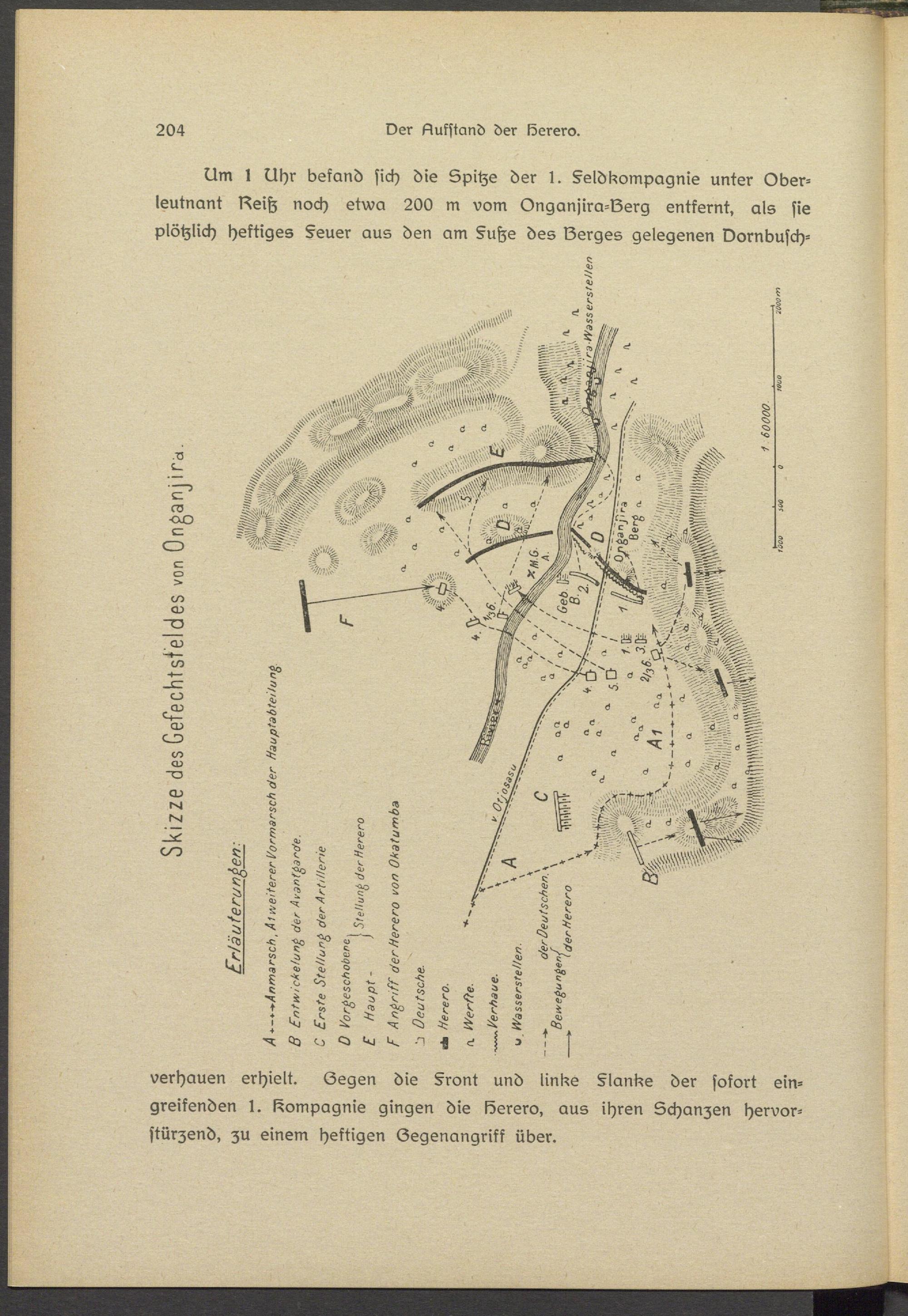 Um I Uhr befand sich die Spitze der 1. §eldkompagnis unter Oberleutnant l^sitz noch etwa 200 m vom Onganjira-IZsrg entkernt, als sie plötzlich heftiges §susr aus den am §utze des Sergss gelegenen vornbusch-