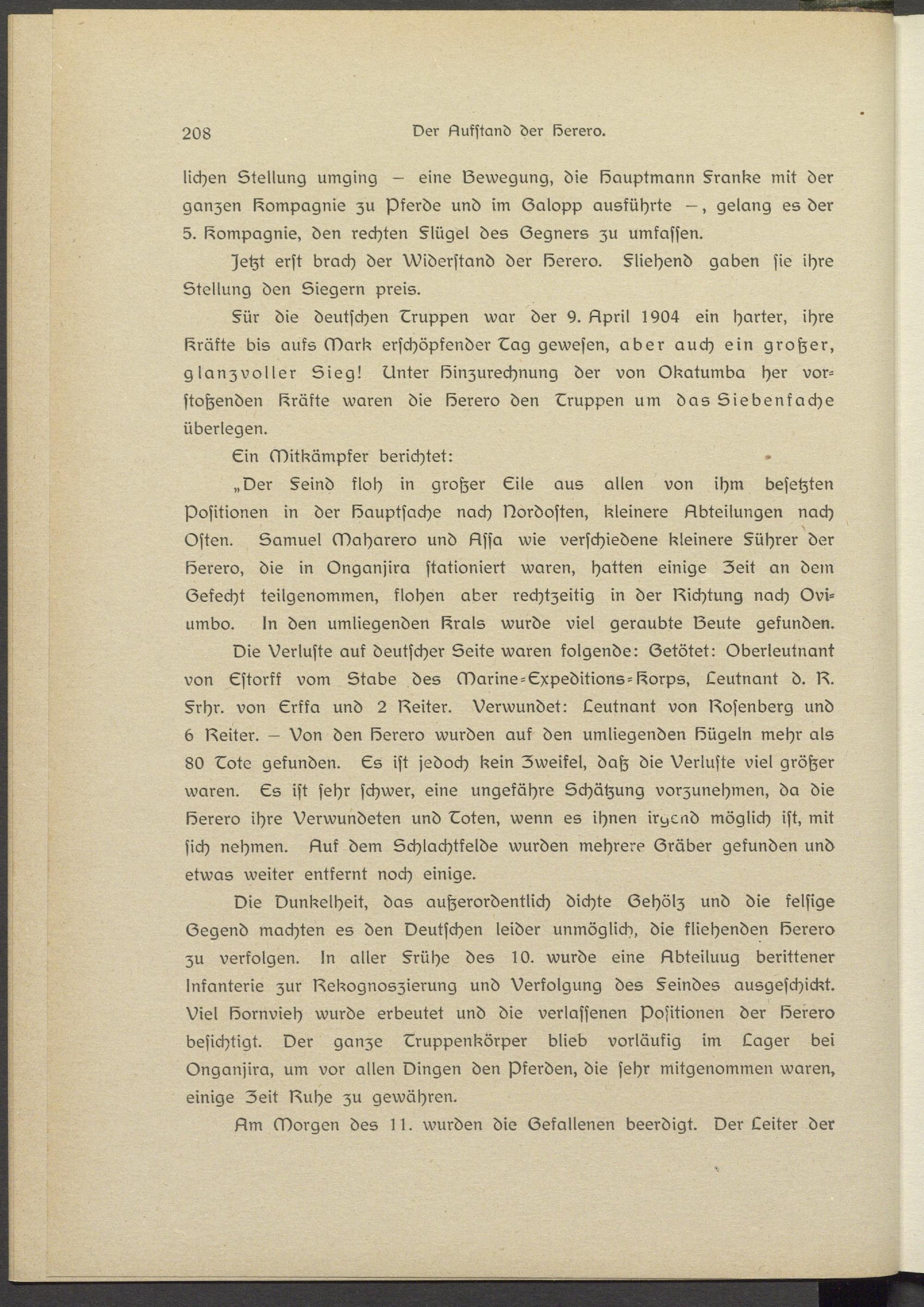 «Der §sind floh in großer Eile aus allen von ihm besetzten Positionen in der Hauptsache nach Nordosten, kleinere Abteilungen nach Osten. Samuel Maharero und Lssa wie verschiedene kleinere §ührsr der löersro, die in Onganjira stationiert waren, hatten einige Zeit an dem Gefecht teilgenommen, flohen aber rechtzeitig in der Lichtung nach Ovi- umbo. In den umliegenden l^rals wurde viel geraubte Leute gefunden.