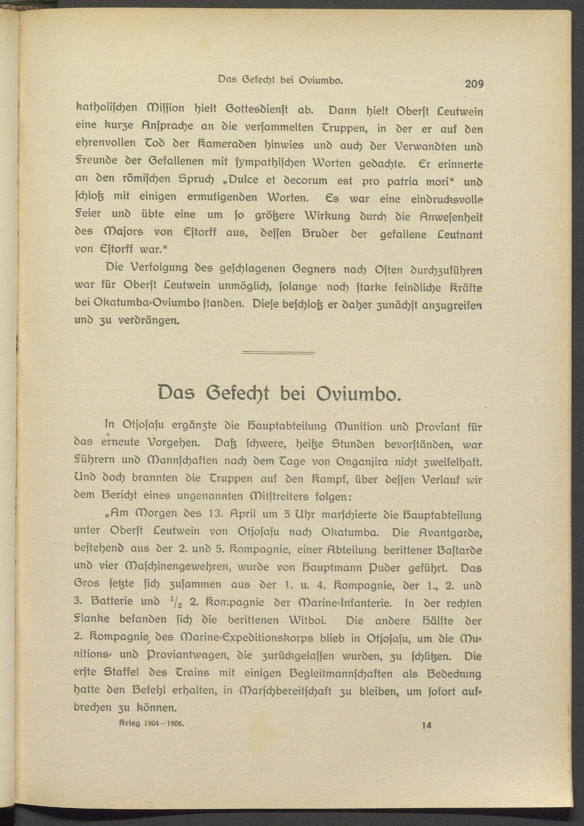 „Am Morgen des 13. April um 5 Uhr marschierte die Hauptabteilung unter Oberst Leutwein von Otjosasu nach Okatumba. Die Avantgarde, bestehend aus der 2. und 5. Compagnie, einer Abteilung berittener bastards und vier Maschinengewehren, wurde von Hauptmann Puder geführt. Das 6ros setzte sich zusammen aus der 1,. u. 4. Compagnie, der l., 2. und 3. IZattsris und ^ 2. Compagnie der Marine-Infanterie. In der rechten §lanks befanden sich die berittenen Witboi. Die andere Hälfte der 2. Kompagnie des Marine-ExpeditionsKorps blieb in Otjosasu, um die Mu- nitions- und Proviantwagen, die zurückgelassen wurden, zu schützen. Die erste Staffel des Drains mit einigen bsgieitmannschakten als bedeckung hatte den bskehl erhalten, in Marschbereitschaft zu bleiben, um sofort aufbrechen zu können.