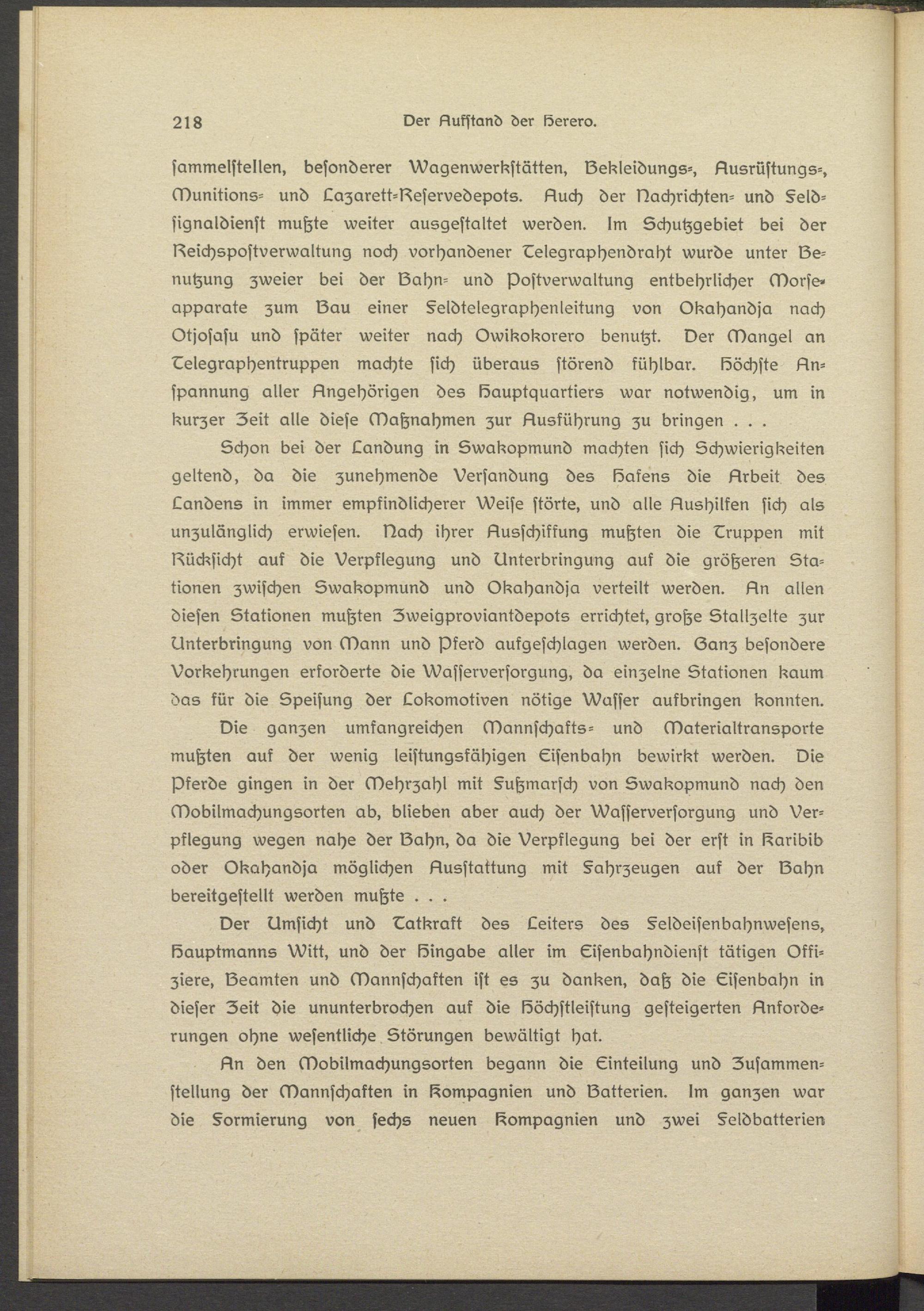 Die ganzen umfangreichen Mannschafts- und Matsrialtransporte mutzten auf der wenig leistungsfähigen Eisenbahn bewirkt werden. Bis Pferde gingen in der Mehrzahl mit §utzmarsch von Swakopmund nach den Mobilmachungsortsn ab, blieben aber auch der Wasserversorgung und Verpflegung wegen nahe der Bahn, da die Verpflegung bei der erst in ßaribib oder Okahandja möglichen Ausstattung mit §ahrzeugsn auf der Bahn bereitgestellt werden mutzte . . .