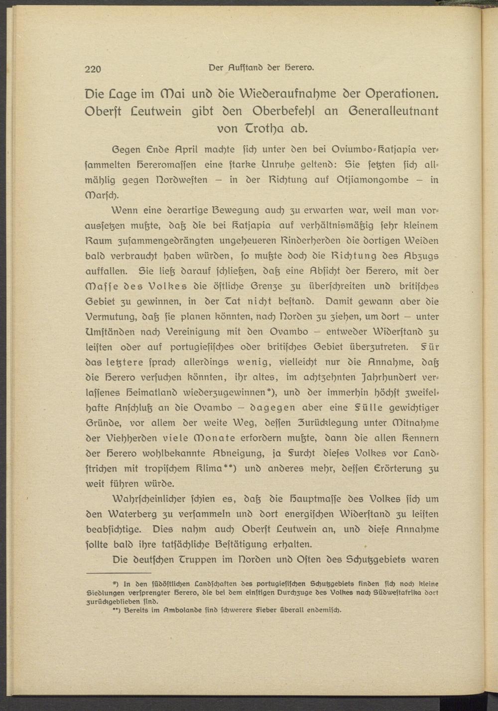 Wahrscheinlicher schien es, datz die Hauptmasse des Volkes sich um den Waterbsrg zu versammeln und dort energischen Widerstand zu leisten beabsichtige. Dies nahm auch Oberst Leutwein an, und diese Annahme sollte bald ihre tatsächliche IZsstätigung erhalten.