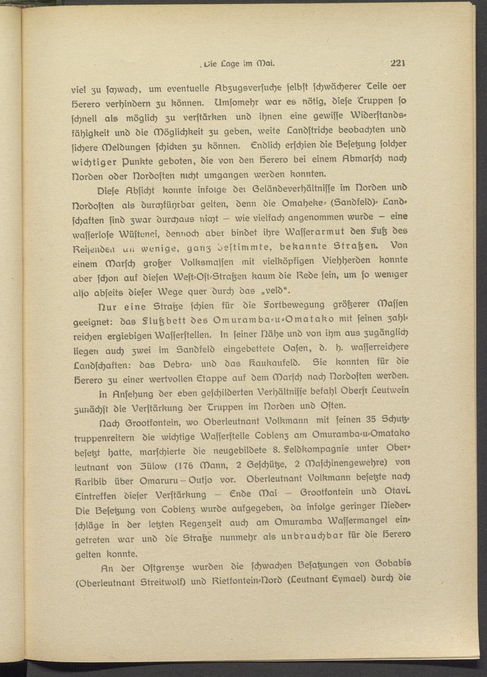 viel zu schwach, um eventuelle Abzugsversuche selbst schwächerer Leile oer löerero verhindern zu können. Llmsomehr war es nötig, diese Lruppen so schnell als möglich zu verstärken und ihnen eine gewisse Widerstandsfähigkeit und die Möglichkeit zu geben, weite Landstriche beobachten und sichere Meldungen schicken zu können. Endlich erschien die Besetzung solcher wichtiger Punkte geboten, die von den löerero bei einem Abmarsch nach Norden oder Dordostsn nicht umgangen werden konnten.