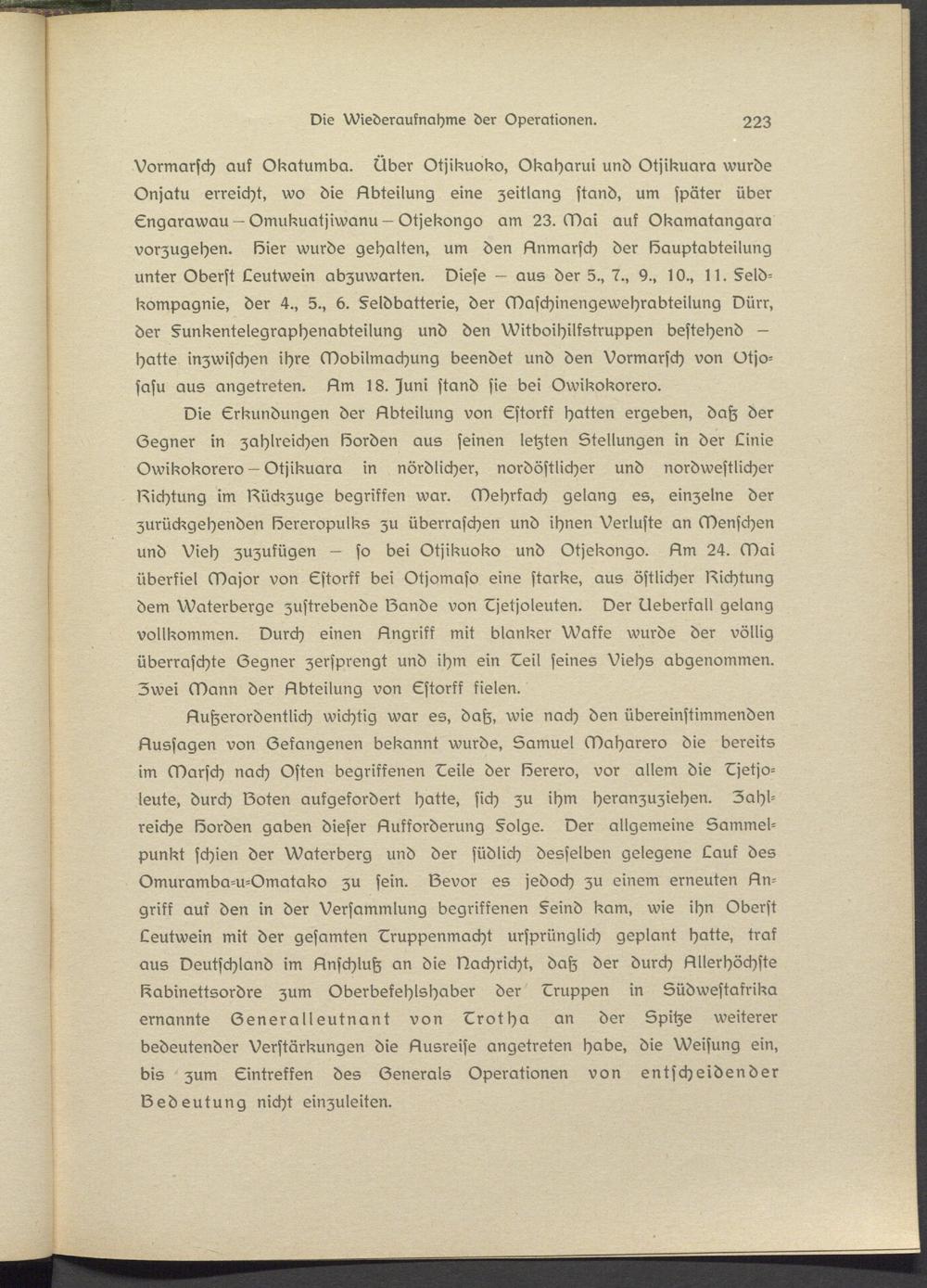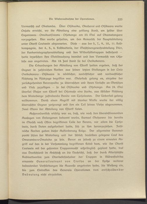 Die Erkundungen der Abteilung von Estorff hatten ergeben, daß der Gegner in zahlreichen Horden aus seinen letzten Stellungen in der Linie Owikokorero - Otjikuara in nördlicher, nordöstlicher und nordwestlicher Sichtung im Sückzuge begriffen war. Mehrfach gelang es, einzelne der zurückgehenden Hereropulks zu überraschen und ihnen Verluste an Menschen und Vieh zuzufügen - so bei Otjikuoko und Otjekongo. Am 24. Mai überfiel Major von Estorff bei Otjomaso eine starke, aus östlicher Sichtung dem Waterberge zustrebende Sande von Ejetjoleuten. Der Dsberfa» gelang vollkommen. Durch einen Angriff mit blanker Waffe wurde der völlig überraschte (Zegner zersprengt und ihm ein Eeil seines Viehs abgenommen. Zwei Mann der Abteilung von Estorff fielen.