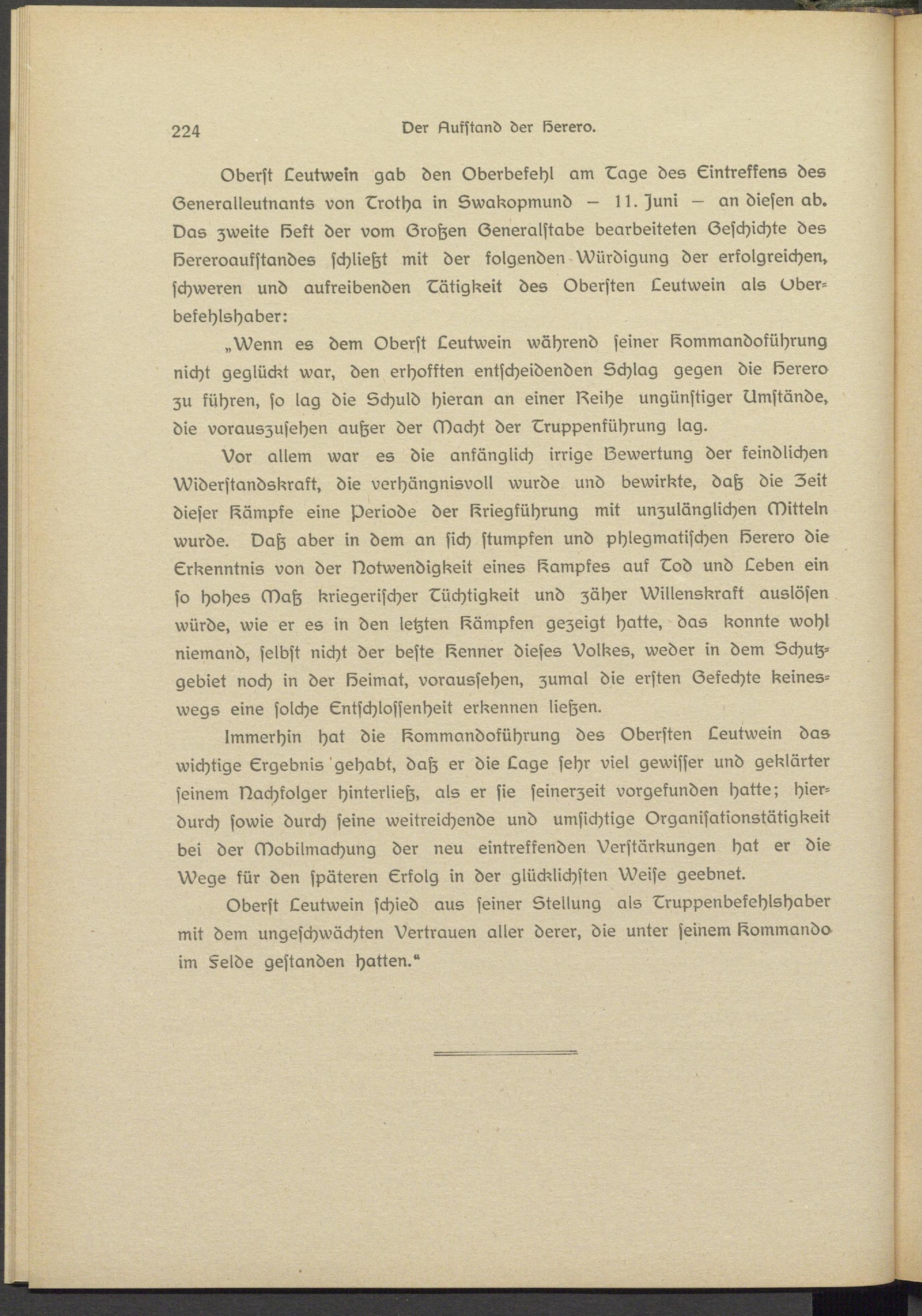 Immerhin hat die Kommandoführung des Obersten Leutwein das wichtige Ergebnis gehabt, daß er die Lage sehr viel gewisser und geklärter seinem Nachfolger hinterließ, als er sie seinerzeit vorgefunden hatte; hierdurch sowie durch seine weitreichende und umsichtige Organisationstätigkeit bei der Mobilmachung der neu eintreffenden Verstärkungen hat er die Wegs kür den späteren Erfolg in der glücklichsten Weise geebnet.