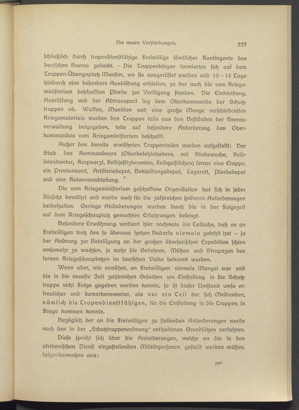 Besonders Erwähnung verdient hier nochmals die Tatsache, daß es an §reiwilligen trotz des so überaus hohen Bedarfs niemals gekehlt hat — ja der Andrang zur Beteiligung an der großen überseeischen Expedition schien umsomehr zu wachsen, je mehr die Gefahren, Mühen und Strapazen des kernen Kriegsschauplatzes im deutschen Volks bekannt wurden.