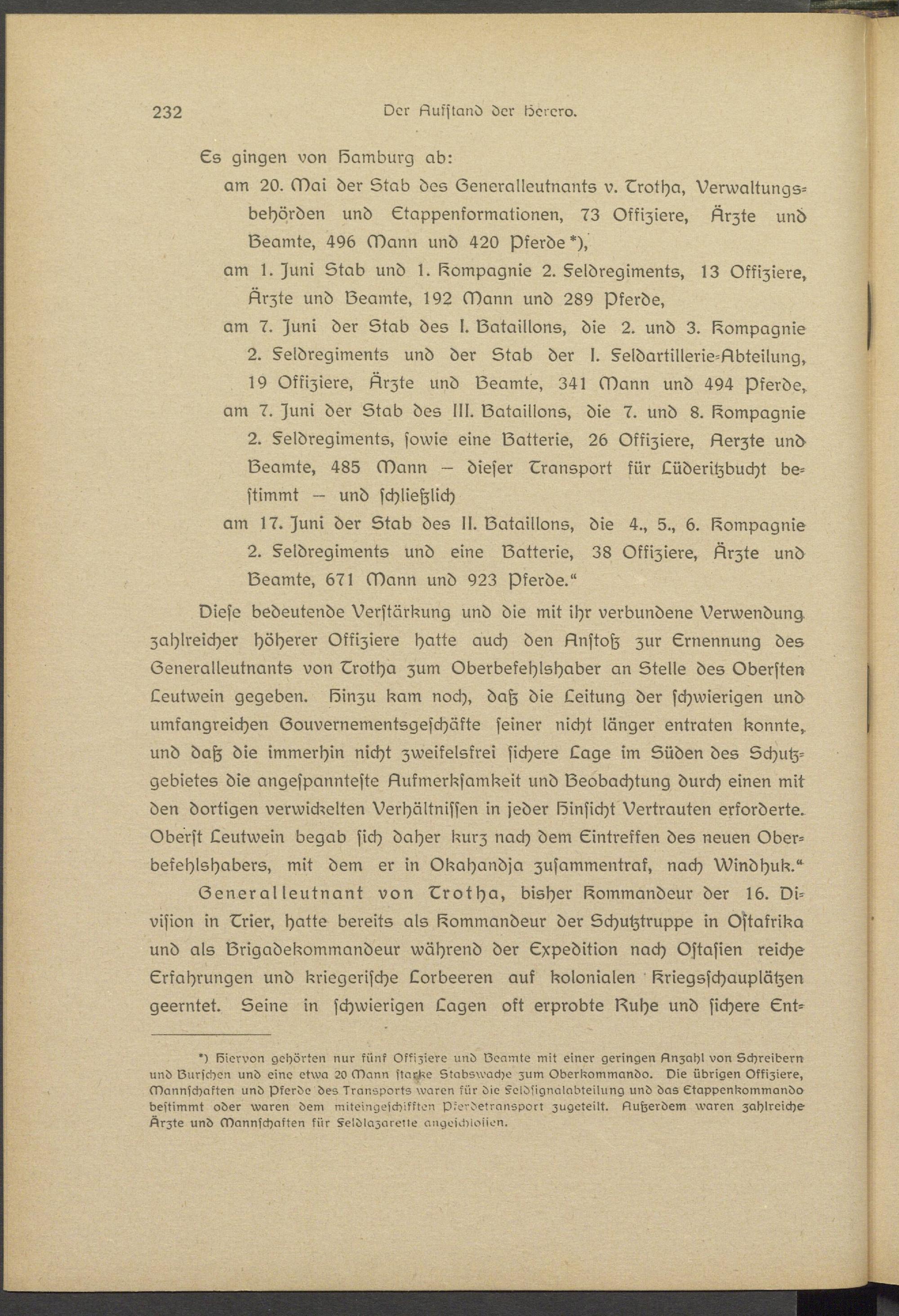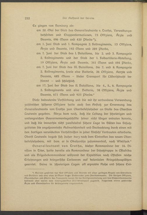 am 20. Mai der Stab des Generalleutnants v. Drotha, Verwaltungsbehörden und Etappenkormationen, 73 Offiziere, Arzte und IZeamts, 49b Mann und 420 Pferds*), am t. jsuni Stab und t. Compagnie 2. §sldregiments, 13 Offiziers, Arzte und lZeamte, 192 Mann und 289 Pferde, am 7. )uni der Stab des I. IZataillons, die 2. und 3. Compagnie 2. §s!drsgimsnts und der Stab der I. §sldartiIlsrie-Nbteilung, 19 Offiziere, Arzte und IZeamts, 341 Mann und 494 Pferds, am 7. jsuni der Stab des III. IZataillons, die 7. und 8. Compagnie 2. §sldrsgimsnts, sowie eine IZatteris, 2b Offiziers, Nsrzts und IZeamts, 485 Mann - dieser Transport für Lüderitzbucht bestimmt — und schließlich