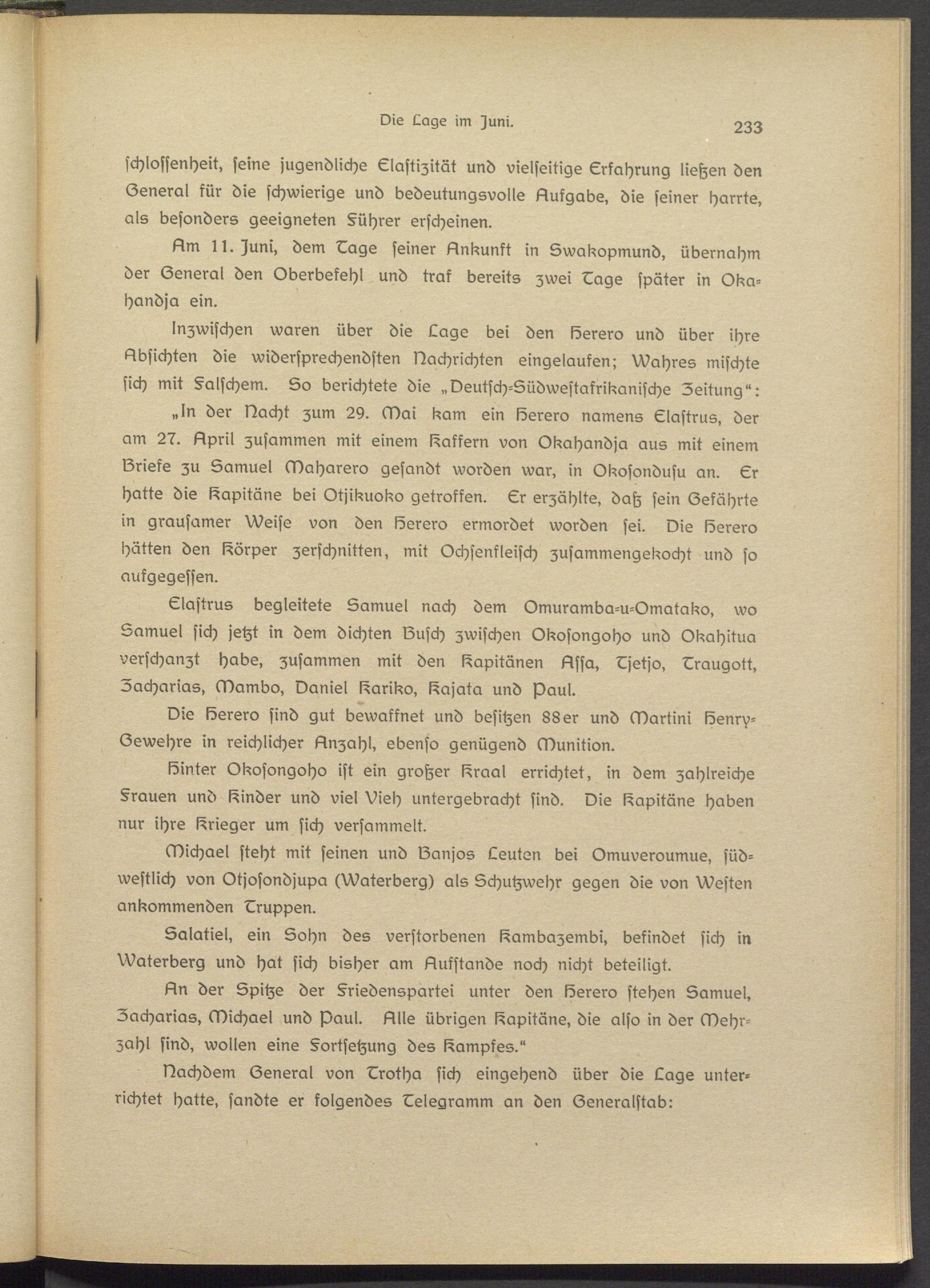„In der Nacht zum 2d. (Nai kam ein löerero namens LIastrus, der am 27. Llpril zusammen mit einem Raffern von Okahandja aus mit einem lörisks zu Samuel (Naharsro gesandt worden war, in Okosondusu an. Lr hatte die Kapitäne bei Otjikuoko getroffen. Sr erzählte, daß sein Gefährts in grausamer Weiss von den löerero ermordet worden sei. Nie löerero hätten den Körper zerschnitten, mit Ochsenfleisch zusammengekocht und so aufgegessen.