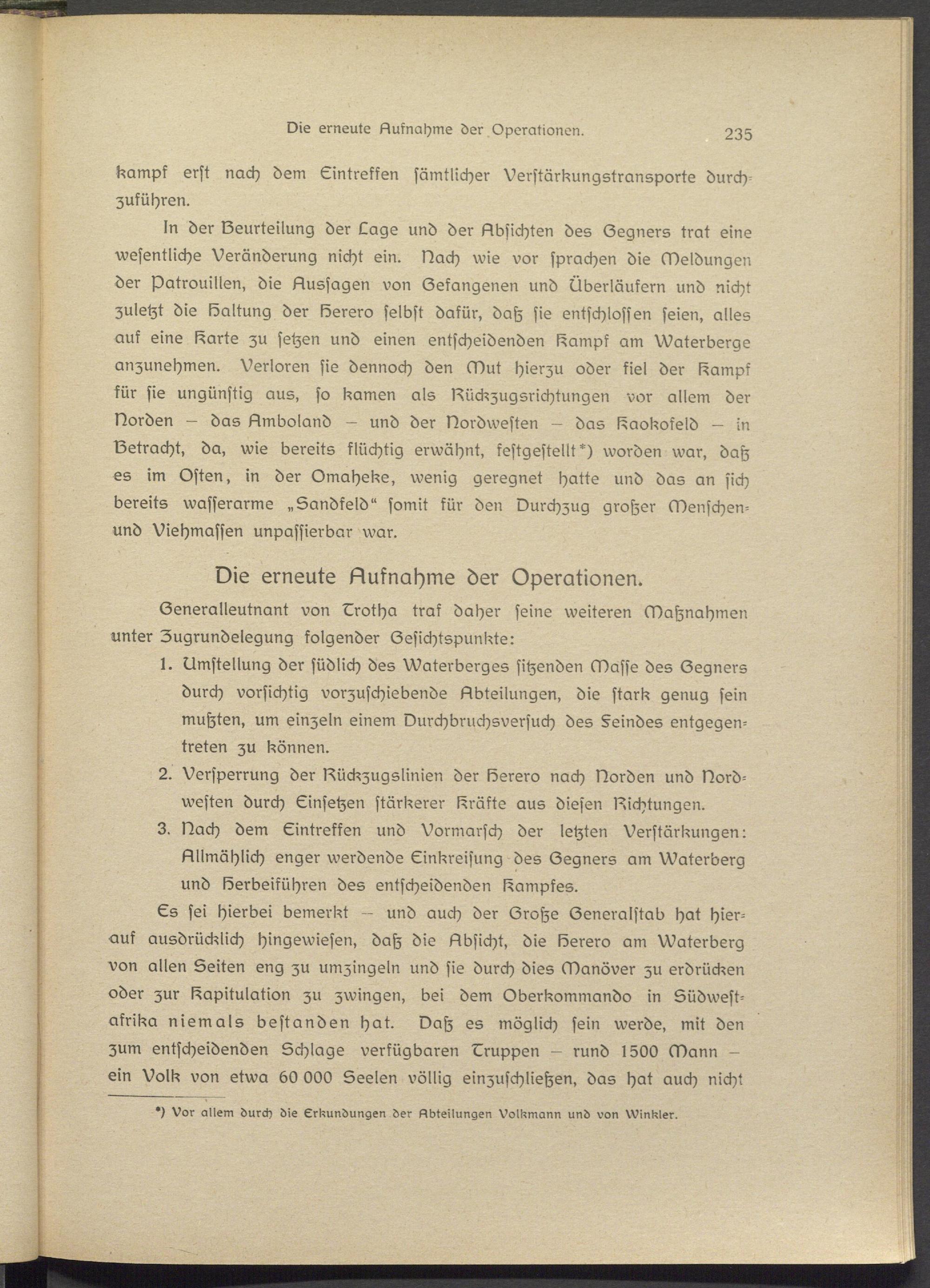 Es sei hierbei bemerkt - und auch der Große Gsneralstab hat hierauf ausdrücklich hingewiesen, datz die Absicht, die löerero am XVaterberg von allen Seiten eng zu umzingeln und sie durch dies Manöver zu erdrücken oder zur Kapitulation zu zwingen, bei dem Oberkommando in Südwestafrika niemals bestanden hat. Daß es möglich sein werde, mit den zum entscheidenden Schlags verfügbaren Eruppen - rund 1500 Mann — ein Volk von etwa 60 000 Seelen völlig einzuschließen, das hat auch nicht