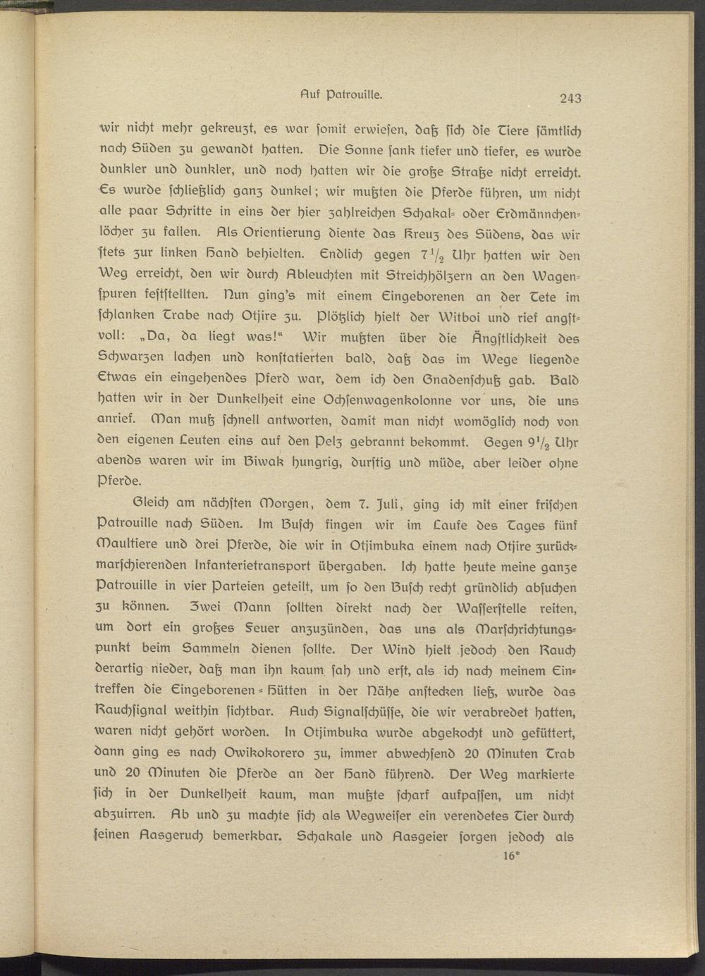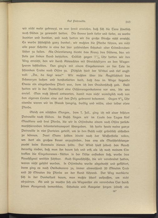 Gleich am nächsten Morgen, dem 7. )uli, ging ich mit einer frischen Patrouille nach Süden. Im lZusch fingen wir im Laufe des Dages fünf Maultiers und drei Pferds, die wir in Otjimbuka einem nach Otjire zurück- marschierenden Infanterietransport übergaben. Ich hatte heute meine ganze Patrouille in vier Parteien geteilt, um so den IZusch recht gründlich absuchen zu können. Zwei Mann sollten direkt nach der Wasserstelle reiten, um dort ein großes §eusr anzuzünden, das uns als Marschrichtungspunkt beim Sammeln dienen sollte. Der Wind hielt jedoch den stauch derartig nieder, daß man ihn kaum sah und erst, als ich nach meinem Eintreffen die Eingeborenen - Sütten in der Nähe anstecken ließ, wurde das Rauchsignal weithin sichtbar. Such Signalschüsse, die wir verabredet hatten, waren nicht gehört worden. In Otjimbuka wurde abgekocht und gefüttert, dann ging es nach Owikokorsro zu, immer abwechssnd 20 Minuten Drab und 20 Minuten die Pferde an der Sand führend. Der Weg markierte sich in der Dunkelheit kaum, man mußte scharf aufpassen, um nicht «bzuirren. Sb und zu machte sich als Wegweiser ein verendetes Disr durch seinen Gasgeruch bemerkbar. Schakale und Sasgsisr sorgen jedoch als