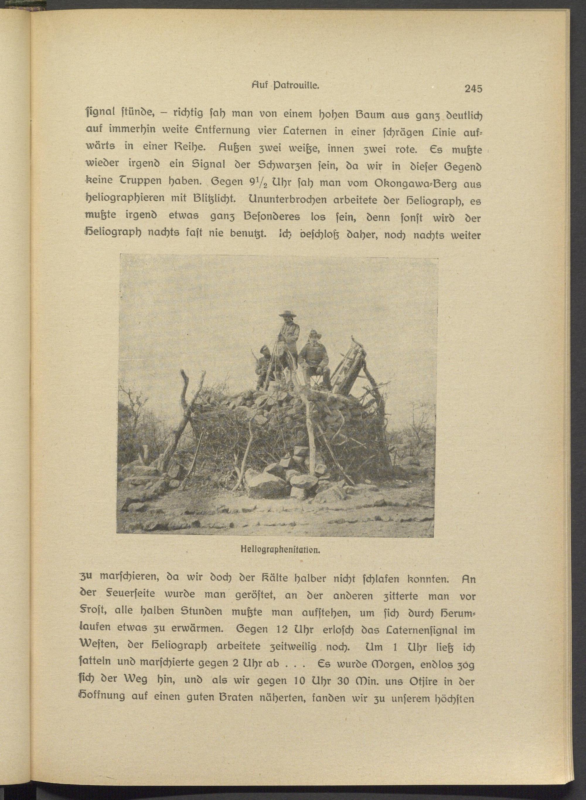 tzu marschieren, da wir doch der Hälte halber nicht schlafen konnten. LIn der §eusrseits wurde man geröstet, an der anderen zitterte man vor Trost, alle halben Stunden mußte man aufstehen, um sich durch Herumlaufen etwas zu erwärmen. Legen 12 Uhr erlosch das Laternensignal im besten, der Heliograph arbeitete zeitweilig noch. Um l Uhr ließ ich satteln und marschierte gegen 2 Uhr ab . . . Es wurde Morgen, endlos zog sich der Weg hin, und als wir gegen 10 Uhr 30 Min. uns Otjire in der Hoffnung auf einen guten IZraten näherten, fanden wir zu unserem höchsten