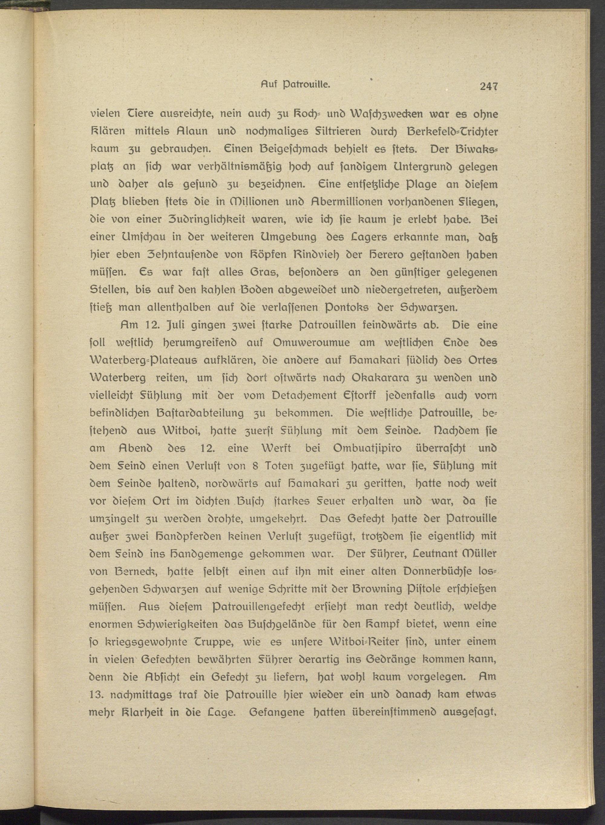 Um 12. Juli gingen zwei starke Patrouillen keindwärts ab. Die eine soll westlich herumgreikend auf Omuweroumue am westlichen Lnds des Waterberg-Plateaus aufklären, die andere auf Bamakari südlich des Ortes Waterberg reiten, um sich dort ostwärts nach Okakarara zu wenden und vielleicht §Lhlung mit der vom Detachement Lstorkk jedenfalls auch vorn befindlichen Bastardabteilung zu bekommen. Die westliche Patrouille, bestehend aus Witboi, hatte zuerst Kühlung mit dem §einde. Nachdem sie am Übend des 12. eine Werkt bei Ombuatjipiro überrascht und dem §eind einen Verlust von 8 lotsn zugefügt hatte, war sie, §ühlung mit dem §einde haltend, nordwärts auf Bamakari zu geritten, hatte noch weit vor diesem Ort im dichten Busch starkes §euer erhalten und war, da sie umzingelt zu werden drohte, umgekehrt. Das Gefecht hatte der Patrouille außer zwei Bandpferden keinen Verlust zugefügt, trotzdem sie eigentlich mit dem §sind ins Bandgemsnge gekommen war. Der §ührer, Leutnant Müller von Bsrneck, hatte selbst einen auf ihn mit einer alten Donnerbüchse los- gehendsn Schwarzen auf wenige Schritte mit der Browning Pistole erschießen müssen. 51us diesem patrouillengefecht ersieht man recht deutlich, welche enormen Schwierigkeiten das Buschgsländs für den Kampf bietet, wenn eins so kriegsgswohnte Lruppe, wie es unsers Witboi-Beiter sind, unter einem in vielen Gefechten bewährten §ührer derartig ins Gedränge kommen kann, denn die Llbsicht ein Gefecht zu liefern, hat wohl kaum vorgelegen. 51m 13. nachmittags traf die Patrouille hier wieder ein und danach kam etwas mehr Klarheit in die Lage. Gefangene hatten übereinstimmend ausgesagt.