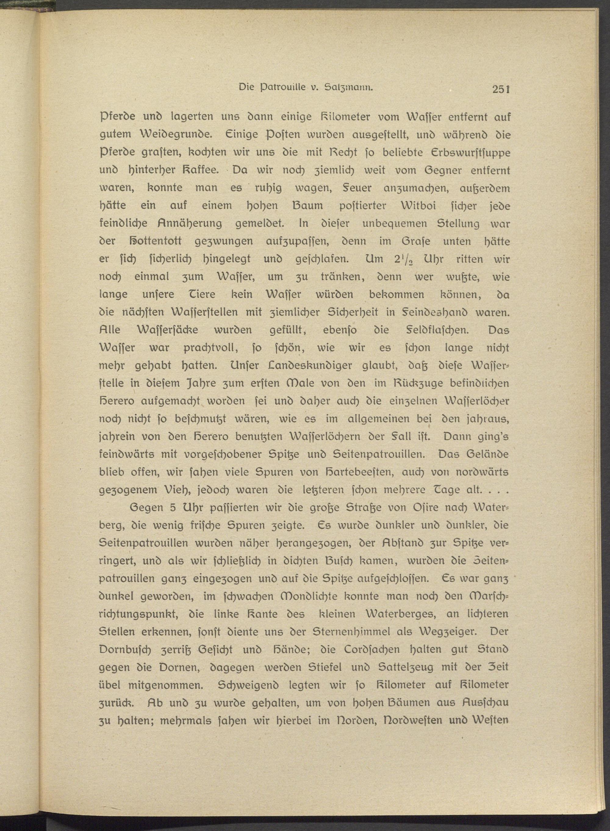 Segen 5 Uhr passierten wir die große Straße von Osire nach Water- berg, die wenig frische Spuren zeigte. Ls wurde dunkler und dunkler, die Ssitenpatrouillen wurden näher herangezogen, der Abstand zur Spitze verringert, und als wir schließlich in dichten Susch kamen, wurden die Seiten- patrouillen ganz eingezogen und auf die Spitze aufgeschlossen. Ls war ganz dunkel geworden, im schwachen Mondlichte konnte man noch den Marschrichtungspunkt, die linke l^ante des kleinen Waterberges, an lichteren Stellen erkennen, sonst diente uns der Sternenhimmsl als Wegzeiger. Der Dornbusch zerriß Gesicht und Sünde; die Lordsachen halten gut Stand gegen die Dornen, dagegen werden Stiefel und Sattelzeug mit der Zeit übel mitgenommen. Schweigend legten wir so Kilometer auf Kilometer zurück. Ab und zu wurde gehalten, um von hohen Säumen aus Ausschau zu halten; mehrmals sahen wir hierbei im Norden, Nordwesten und Westen