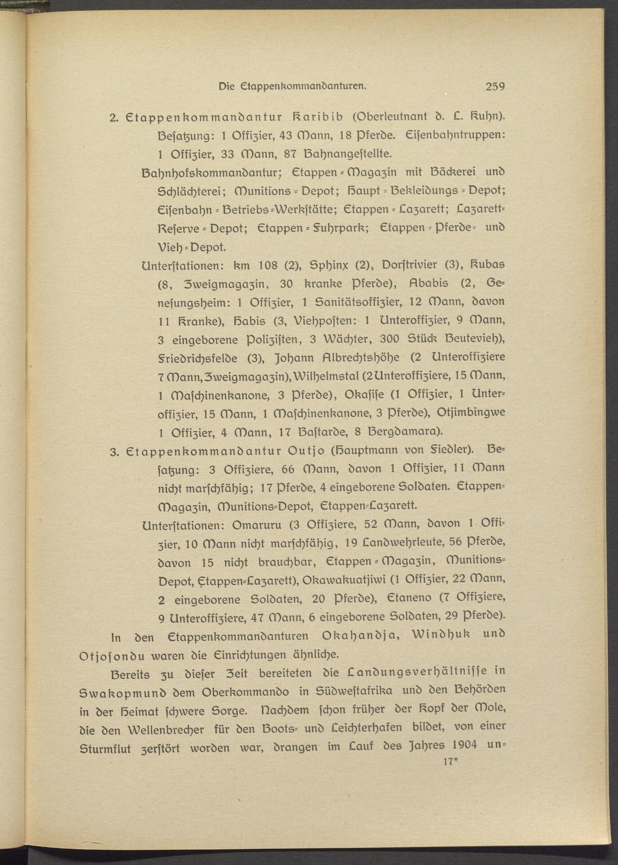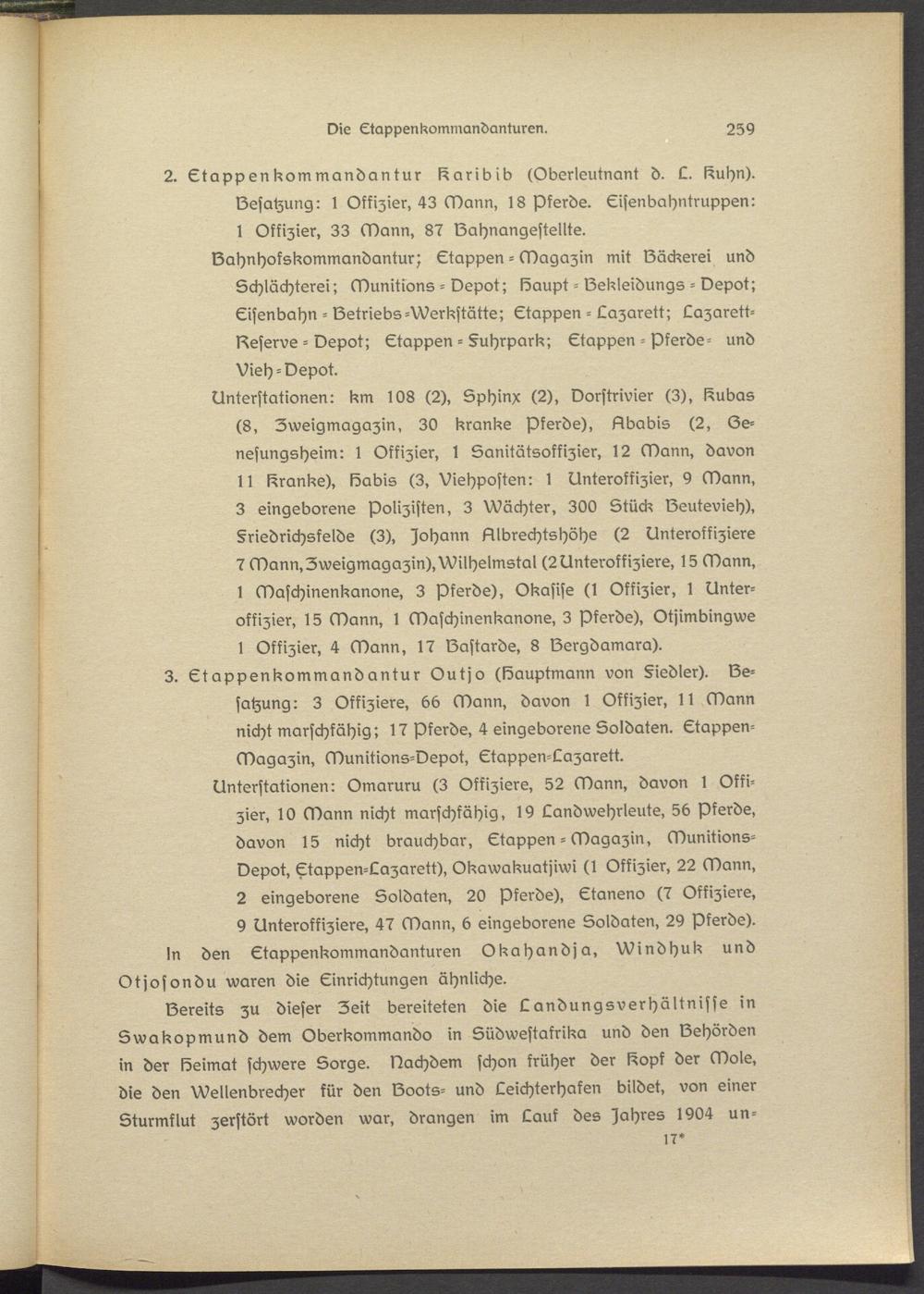 Untsrstationen: km 108 (2), Sphinx (2), Dorstrivier (3), Kubas (8, Zwsigmagazin, 30 kranke Pferde), Llbabis (2, Genesungsheim: 1 Offizier, I Sanitätsoffizier, 12 Mann, davon I I kranke), Kabis (3, Viehposten: 1 Unteroffizier, 9 Mann, 3 eingeborene Polizisten, 3 Wächter, 300 Stück Deutevieh), Friedrichsfelde (3), Johann Lllbrechtshöhe (2 Unteroffiziere 7 Mann,Zweigmagazin), Wilhelmstal (2 Unteroffiziere, 15 Mann, 1 Maschinenkanone, 3 Pferde), Okasise (1 Offizier, I Unteroffizier, 15 Mann, 1 Maschinenkanone, 3 Pferde), Otjimblngwe