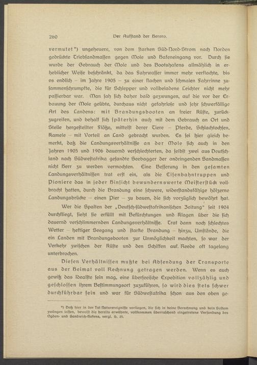 vermutet*) ungeheuere, von dem starken Süd-Nord-Strom nach Norden gedrückte Eriebsandmassen gegen Mole und Satsnemgang vor. vurch sie wurde der Gebrauch der Mole und des Bootshakens allmählich in erheblicher Weiss beschränkt, da das §ahrwasssr immer mehr verflachte, bis es endlich - im )ahrs 1905 - zu einer flachen und schmalen §ahrrinne zusammenschrumpfte, die für Schlepper und vollbsladsne Leichter nicht mehr passierbar war. Man sah sich daher bald gezwungen, auf die vor der Erbauung der Mole geübte, durchaus nicht gefahrlose und sehr schwerfällige Llrt des Landens: mit Brandungsbooten an freier k^üste, zurückzugreifen, und behalf sich späterhin auch mit dem Gebrauch an Ort und Stelle hergestellter §lötze, mittelst derer Eiere - Pferds, Schlachtochsen, Kamele - mit Vorteil an Land gebracht wurden. Es sei hier gleich bemerkt, datz die Landungsverhältnisse an der Mole sich auch in den fahren 1905 und 190b dauernd verschlechterten, da selbst zwei aus Deutschland nach Südwsstafrika gesandte Ssebagger der andringenden Sandmassen nicht löerr zu werden vermochten. Eine Besserung in den gesamten Landungsvsrhältnisssn trat erst ein, als die Eisenbahntruppen und Pioniere das in jeder Binsicht bewundsrnswsrte Meisterstück vollbracht hatten, durch die Brandung eine schwere, widerstandsfähige hölzerne Landungsbrücke - einen Pier - zu bauen, die sich vorzüglich bewährt hat.