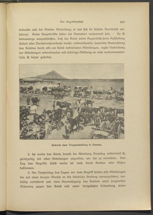 bukonde und bei Station VVatsrbsrg; er hat sich im dichten Dornbusch verschanzt. Seine löauptkräkte sollen bei löamakari versammelt sein. - Cs ist keineswegs ausgeschlossen, daß der §eind jeden Augenblick seine Aufstellung ändert oder Durchbruchsversuchs macht; aufmerksamste, dauernde Deobachtung des §eindes durch alle am §eind befindlichen Abteilungen, regste Verbindung der Abteilungen untereinander und sofortige Meldung an mich vorkommenden- kalls ist daher geboten.