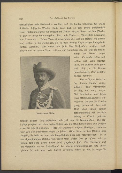 nanzoffiziere und Meldereiter vorüber, und die bunten Fähnchen der Stöbe flatterten lustig im Winde. Doch bald gab es den ersten Zwischenfall. Unser 5ibtsilungsführer Oberstleutnant Müller stürzte schwer mit dem Pferds, so daß er lange besinnungslos blieb, und Major v. Michlenkels übernahm das Kommando. )sdsn Moment erwarteten wir, auf die Ssrsro zu stohsn, doch hatten sie die Stellungen, die sie noch wenige Oags vorher innegehabt hatten, geräumt. Wir waren die pad über Orusu-Vley marschiert und gingen nun an einem l^ivier entlang auf löamakari los, wo jetzt die Haupt