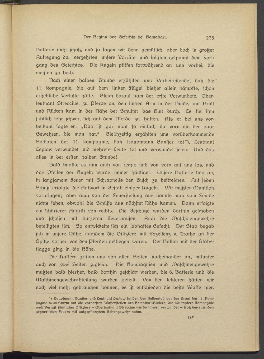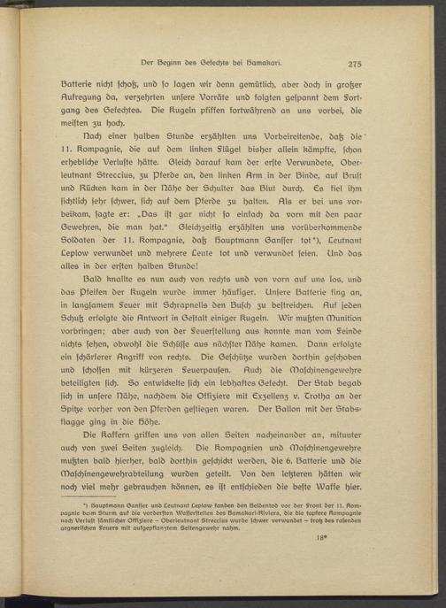 Bach einer halben Stunde erzählten uns Vorbeireitende, daß die' l l. Compagnie, die auf dem linken §lügsl bisher allein kämpfte, schon erhebliche Verluste hätte. Gleich darauf kam der erste Verwundete, Oberleutnant Streccius, zu Pferde an, den linken Arm in der Binde, auf Brust und Bücken kam in der Bähe der Schulter das Blut durch. Es fiel ihm sichtlich sehr schwer, sich auf dem Pferde zu halten. Als er bei uns vorbeikam, sagte er: „Oas ist gar nicht so einfach da vorn mit den paar Gewehren, die man hat." Gleichzeitig erzählten uns vorüberkommende Soldaten der N. Compagnie, daß Bauptmann Gansser tot*), Leutnant Leplow verwundet und mehrere Leute tot und verwundet seien. Und das alles in der ersten halben Stunde!