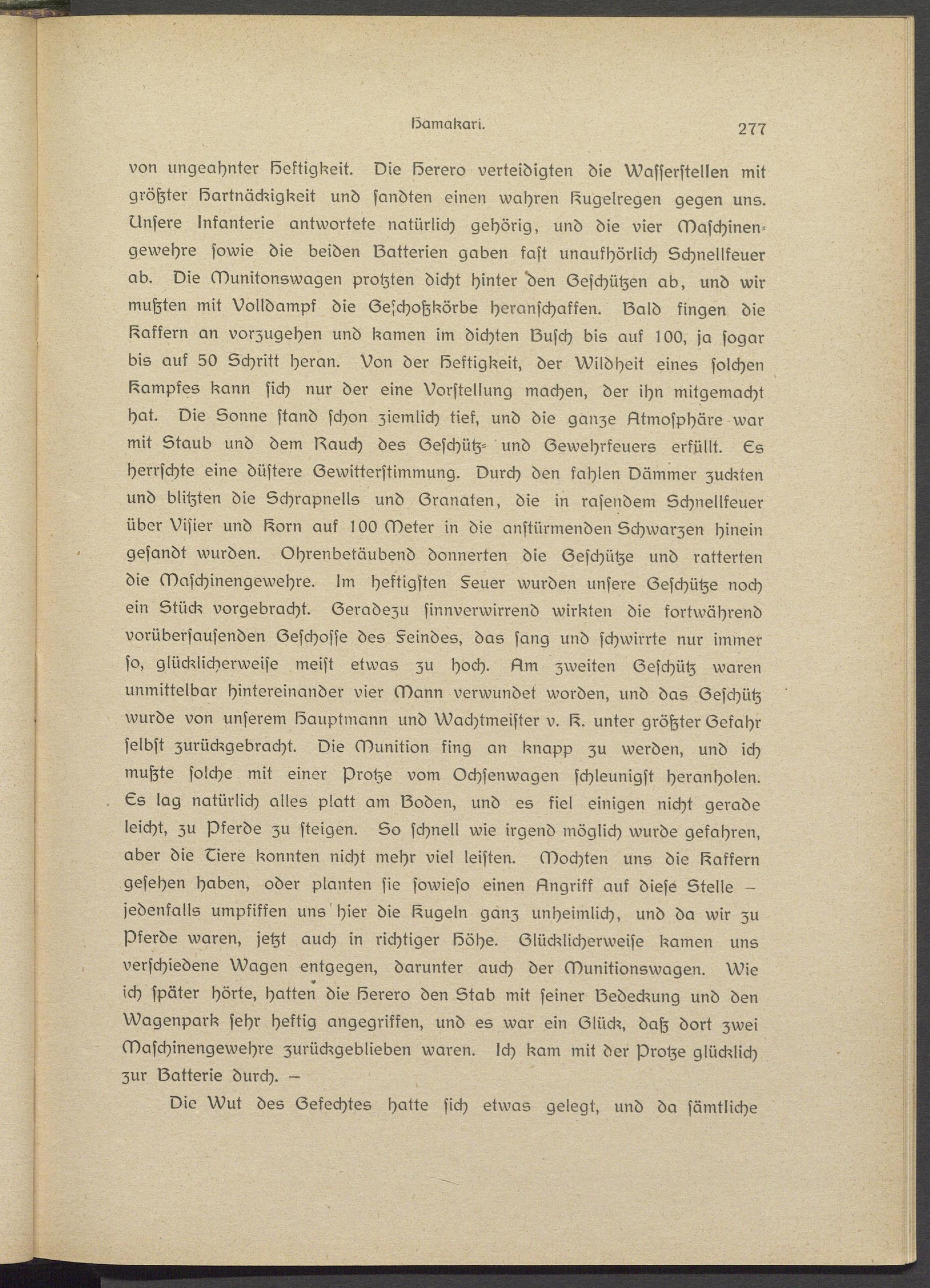 von ungeahnter Nettigkeit. Die Bersro verteidigten die Wasserstellen mit größter Hartnäckigkeit und sandten einen wahren Kugelregen gegen uns. Unsere Infanterie antwortete natürlich gehörig, und die vier Maschinengewehrs sowie die beiden Batterien gaben tast unaufhörlich Schnellfeuer ab. Die Munitonswagen protzten dicht hinter "den Beschützen ab, und wir mutzten mit Volldampf die Beschotzkärbs heranschakksn. Bald fingen die Raffern an vorzugehen und kamen im dichten Busch bis auf lOO, ja sogar bis auf 50 Schritt heran. Von der löektigkeit, der Wildheit eines solchen Dampfes kann sich nur der eine Vorstellung machen, der ihn mitgemacht hat. Die Sonne stand schon ziemlich tief, und die ganze Atmosphäre war mit Staub und dem Bauch des Beschütz- und Bswehrteuers erfüllt. Bs herrschte eine düstere Bewitterstimmung. Durch den kahlen Dümmer zuckten und blitzten die Schrapnells und Branaten, die in rasendem Schnellfeuer über Visier und ßorn auf 100 Meter in die anstürmenden Schwarzen hinein gesandt wurden. Ohrenbetäubend donnerten die Beschütze und ratterten die Maschinengewehre. Im heftigsten §susr wurden unsere Beschütze noch ein Stück vorgebracht. Beradszu sinnverwirrend wirkten die fortwährend vorübsrsaussnden Beschösse des §eindes, das sang und schwirrte nur immer so, glücklicherweise meist etwas zu hoch. Am zweiten Beschütz waren unmittelbar hintereinander vier Mann verwundet worden, und das Beschütz wurde von unserem löauptmann und Wachtmeister v. ß. unter größter Bekahr selbst zurückgebracht. Die Munition fing an knapp zu werden, und ich mutzte solche mit einer protze vom Ochsenwagen schleunigst heranholen. Bs lag natürlich alles platt am Boden, und es fiel einigen nicht gerade leicht, zu Pferde zu steigen. So schnell wie irgend möglich wurde gefahren, aber die Disre konnten nicht mehr viel leisten. Mochten uns die Raffern gesehen haben, oder planten sie sowieso einen Angriff auf diese Stelle - jedenfalls umpfiktsn uns hier die kugeln ganz unheimlich, und da wir zu Pferds waren, jetzt auch in richtiger lööhe. Blücklicherweise kamen uns verschiedene Wagen entgegen, darunter auch der Munitionswagen. Wie ich später hörte, hatten die löerero den Stab mit seiner Bedeckung und den Wagenpark sehr heftig angegriffen, und es war ein Blück, daß dort zwei Maschinengewehrs zurückgeblieben waren. Ich kam mit der protze glücklich zur Batterie durch. —
