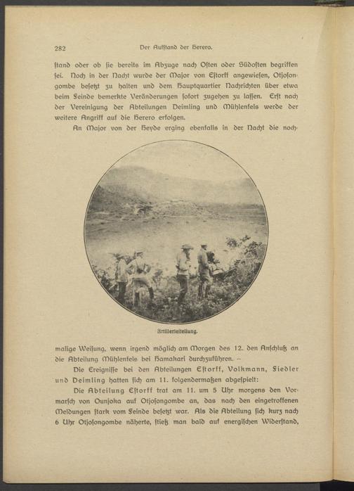 Oie Abteilung Estorff trat am II. um 5 Uhr morgens den Vormarsch von Ounjoka auf Otjosongombs an, das nach den eingstroffenen Meldungen stark vom §sinde besetzt war. Als die Abteilung sich kurz nach b vhr Otjosongombs näherte, stistz man bald auf energischen Widerstand,