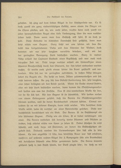 gefallen. Ich ging auf dem linken §lügel in der Schützenlinie vor. Gs ist doch zuerst ein ganz niederträchtiges Gefühl, wenn einem die Dinger um die Ohren pfeifen, und ich, wie wohl jeder, machte denn auch zuerst vor jeder heranpfeikenden I^ugsl eine tiefe Verbeugung, über die man nachher selber lacht. Denn wenn man das Geschoß erst hört, ist es doch zu spät. Diese Gefechte im dichtesten Dornbusch sind grätzlich, denn man sieht nichts vom (Zegner. <Zanz dicht vor uns hörten wir das 6s- brüll des fortgetriebenen Viehs und das Schreien der Weiber; doch konnten wir nur sehr langsam vorwärts krischen, weil wir bei der geringsten Sswsgung stark beschossen wurden. 6anz in meiner Dähe erhielt der Leutnant Ssebeck einen Kopfschutz und war auch nach kürzester Zeit tot. Dicht lange nachher erhielt ein Unteroffizier einen schweren l^nochsnschutz durch den Oberarm, der ihm sofort verbunden werden mutzte. Gr wurde auch gleich etwas hinter die §ront geschafft und verbunden. Wer sich nur im geringsten aufrichtete, in dessen Dähs schlugen sofort die kugeln ein. Da hsitzt es denn, Zähne zusammenbeißen und sich nicht beirren lassen. So zog sich das Gefecht stundenlang hin; sehr langsam, aber sicher drängten wir den §eind zurück. Wenn die Sache einmal stockte, oder wir sehr stark beschossen wurden, dann kamen die Maschinengewehrs und halfen uns aus der patsche. Das ist eins wunderbare Waffe für den, der sie kür sich hat. §ür den Gegner ist sie schrecklich. Wir hatten vorher von einem Gefangenen gehört, datz die lösrsro die Maschinengewehrs stürmen wollten, weil sie deren Furchtbarkeit erkannt hätten. Ginmal versuchten sie es mit seltener Gnergie, dann nicht wieder. Wie furchtbar diese Waffe wirkt, habe ich nachher an einer Sersroleiche gesehen. Diese war buchstäblich durchlöchert wie ein Sieb. Der lösrero ist im lZuschkampk ein sehr schlimmer Gegner. Mutig wie ein Löwe, ist er dabei verschlagen wie einer. Die lösrero verstehen sich derartig hinter Säumen und Süschsn zu decken, datz absolut nichts von ihnen zu sehen ist. Dabei schießen sie nicht schlecht, und noch dazu mit Patronen, an denen die Geschotzspitzen abgeteilt sind. Dadurch werden die Verwundungen hier fast alle so sehr schwer. Gs war ungefähr 12 Llhr, das feindliche §euer war käst erloschen, nachdem auf unserem rechten §Iügel die 2. Compagnie (die alte §rankssche) mit kolossalem Schneid eine Sähe genommen hatte. Die Sonne brannte glühend heiß in den Dusch hinein, der Durst plagte sehr; da hieß es mit