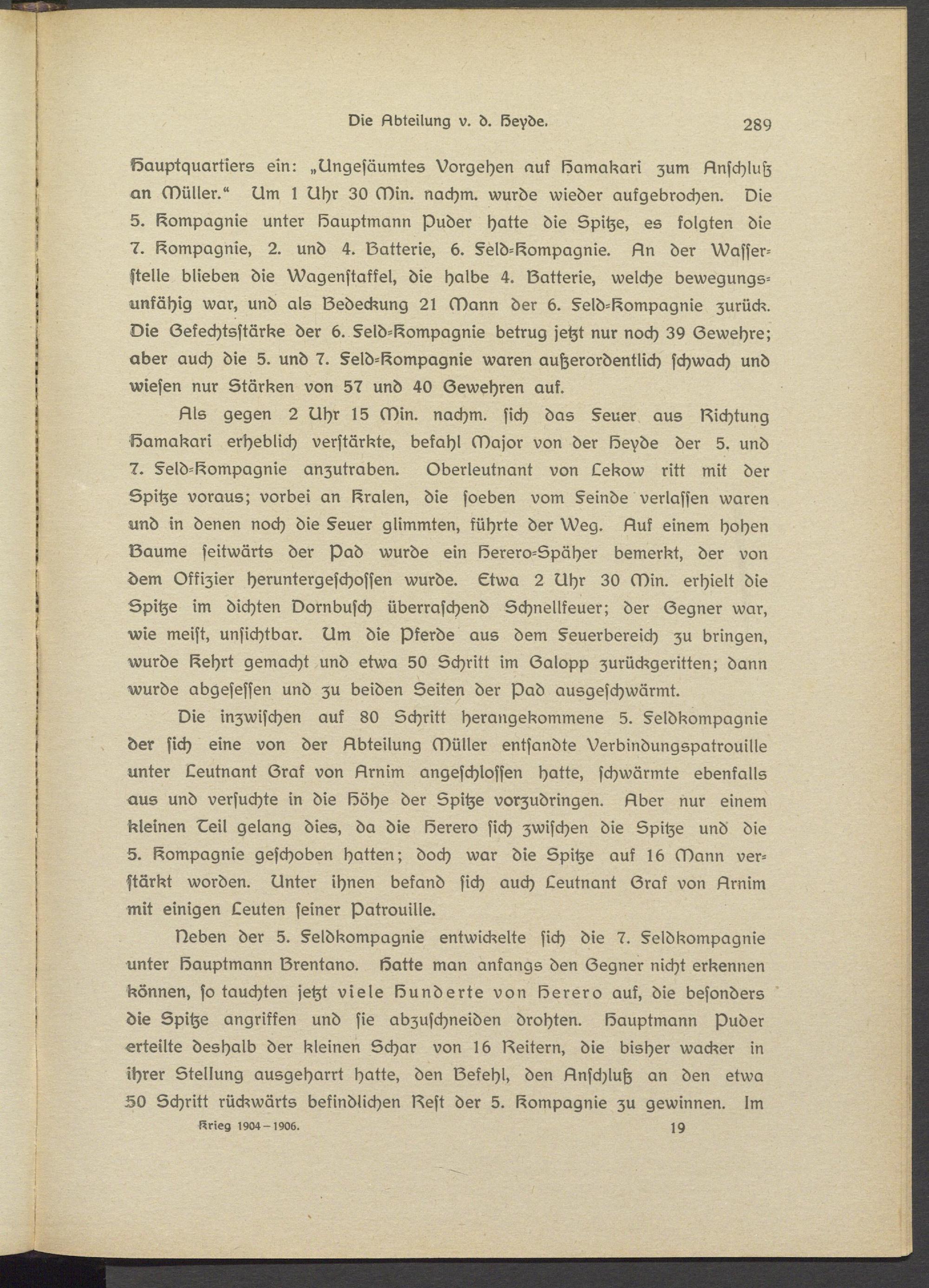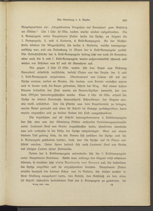 Als gegen 2 Uhr 15 Min. nachm. sich das §suer aus Bichtung Bamakari erheblich verstärkte, befahl Major von der Bs^de der 5. und 7. §eld-Bompagnie anzutraben. Oberleutnant von Lekow ritt mit der Spitze voraus; vorbei an Oralen, die soeben vom §einds verlassen waren und in denen noch die §euer glimmten, führte der Weg. Auf einem hohen Baums seitwärts der pad wurde ein Bersro-Späher bemerkt, der von dem Offizier heruntergeschossen wurde. Etwa 2 Uhr 30 Min. erhielt die Spitze im dichten Dornbusch überraschend Schnellfeuer; der Gegner war, wie meist, unsichtbar. Um die Pferds aus dem §suerbereich zu bringen, wurde ßshrt gemacht und etwa 50 Schritt im Galopp zurückgeritten; dann wurde abgesessen und zu beiden Seiten der pad ausgeschwärmt.