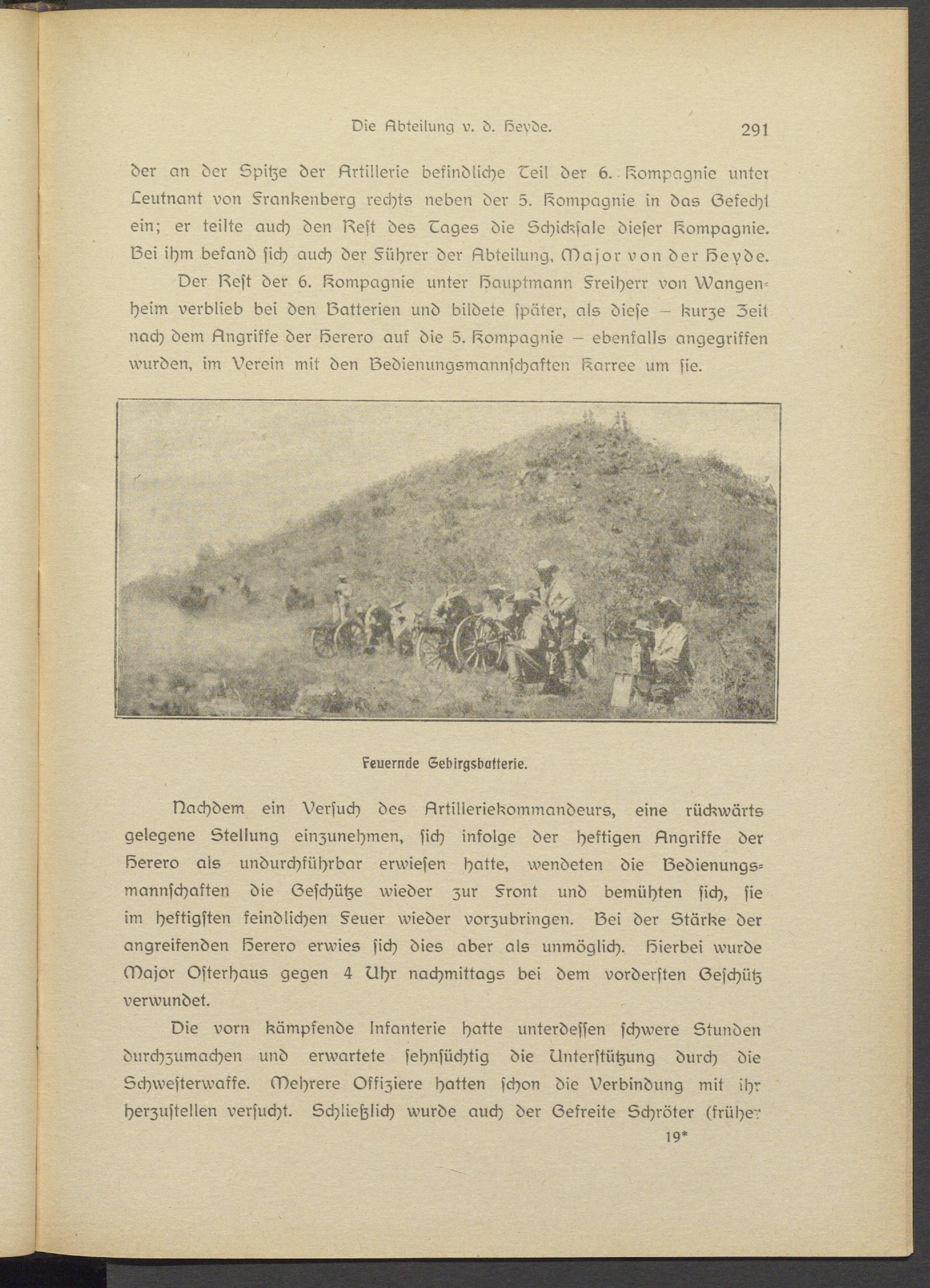 Nachdem ein Versuch des Artilleriekommandeurs, eine rückwärts gelegene Stellung einzunehmen, sich infolge der heftigen Angriffe der Berero als undurchführbar erwiesen hatte, wendeten die Bedienungsmannschaften die Beschütze wieder zur §ront und bemühten sich, sie >m heftigsten feindlichen §euer wieder vorzubringen. Bei der Stärke der angreifenden Berero erwies sich dies aber als unmöglich. Bierbei wurde Major Osterhaus gegen 4 Uhr nachmittags bei dem vordersten Beschütz verwundet.