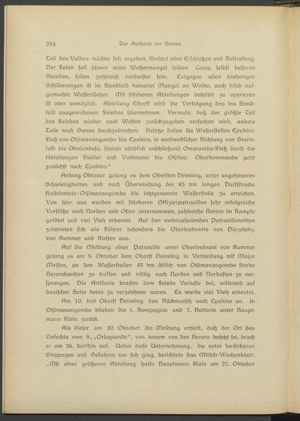 Anfang Oktober gelang es dem Obersten Deimling, unter ungeheueren Schwierigkeiten und nach Überwindung der 85 km langen Durststrecke I^alkkontein-Otjimanangombs die letztgenannte Wasserstelle zu erreichen. Von hier aus wurden mit stärkeren Offizisrpatrouillsn sehr erfolgreiche Vorstöße nach Norden und Osten unternommen, zahlreiche lösrero im dampfe getötet und viel Vieh erbeutet. Auf den weitausholendsn patrouillsnritten zeichneten sich als §Uhrsr besonders die Oberleutnants von Diezelsk^, von Kummer und Kirsten aus.