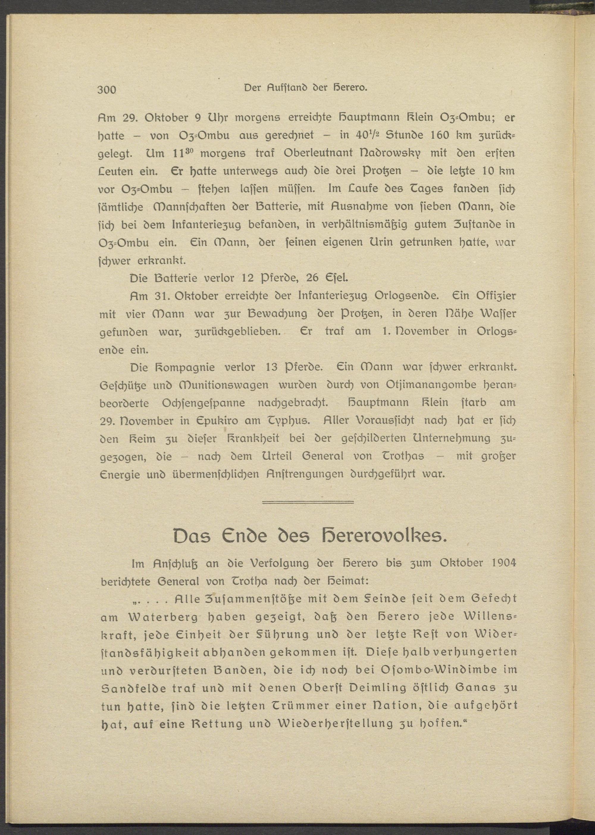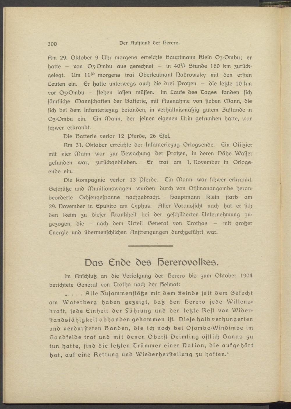 „. . . . Nils Zusammenstöße mit dem Feinde seit dem Gefecht am Waterberg haben gezeigt, daß den lösrero jede Willsns- krakt, jede Einheit der Führung und der letzte Best von Widerstandsfähigkeit abhanden gekommen ist. Biese halb verhungerten und verdursteten Banden, die ich noch bei Osombo-Windimbe im Sandkslde traf und mit denen Oberst veimling östlich Ganas zu tun hatte, sind die letzten Erümmsr einer Bation, die aufgehört hat, auf eine Bettung und Wiederherstellung zu hoffen."