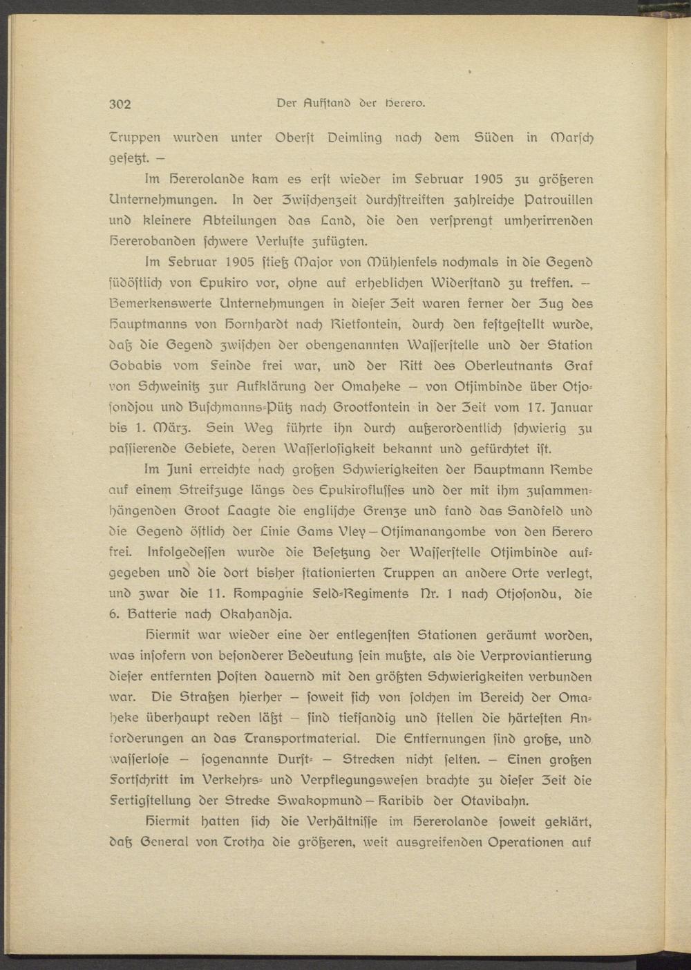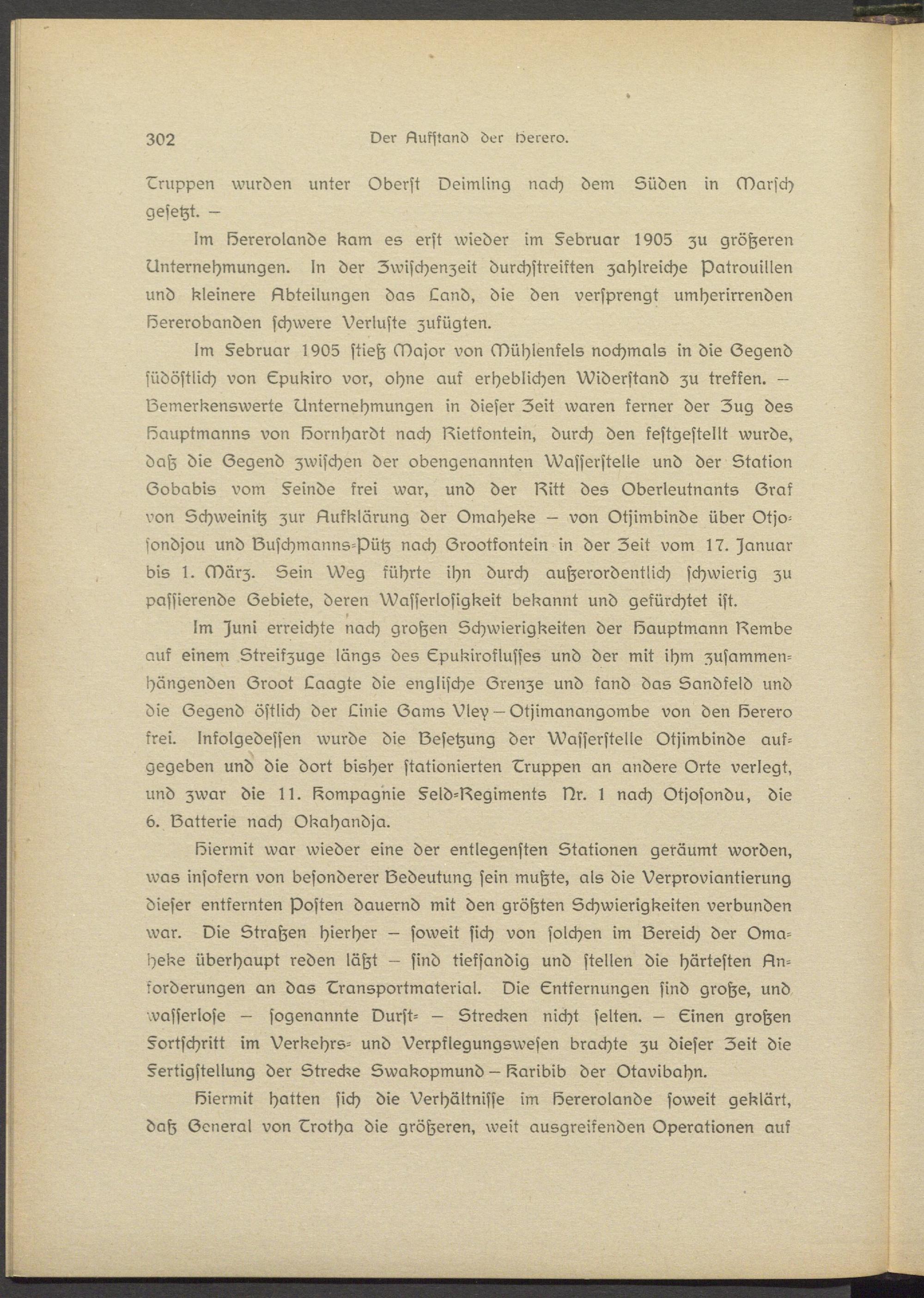 Im §ebruar 1905 stieß Major von Mühlenkels nochmals in die Gegend südöstlich von Epukiro vor, ohne auf erheblichen Widerstand zu treffen. - Bemerkenswerte Unternehmungen in dieser Zeit waren ferner der Zug des Bauptmanns von Bornhardt nach Bistkontein, durch den festgestellt wurde, daß die Gegend zwischen der obsngsnannten Wasserstelle und der Station Oobabis vorn §einds frei war, und der Bitt des Oberleutnants Graf von Schwsinitz zur Aufklärung der Omaheks - von Otsimbinds über Otjo- sondjou und Buschmanns-Pütz nach Srootkontein in der Zeit vom 17. Januar bis I. März. Sein Weg führte ihn durch außerordentlich schwierig zu passierende Gebiets, deren Wasserlosigkeit bekannt und gefürchtet ist.