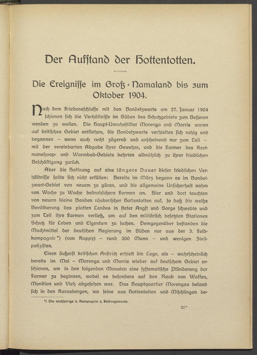 Einen äußerst kritischen Anstrich erhielt die Lage, als - wahrscheinlich bereits im Mai - Morenga und Morris wieder auf deutschem Bediel erschienen, um in den folgenden Monaten eins systematische Plünderung der Farmer zu beginnen, wobei es besonders auf den Baub von Walken, Munition und Vieh abgesehen war. Das Hauptquartier Morengas befand sich in den l^arasbergen, wo seine aus Hottentotten und Mischlingen be-