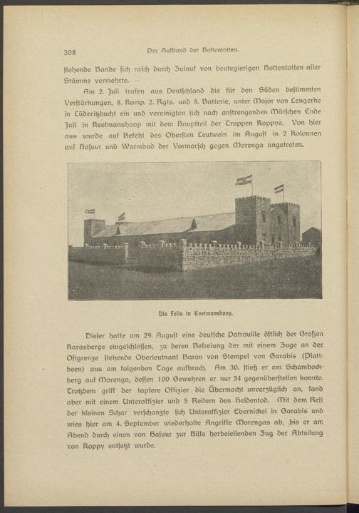 Dieser hatte am 2Y. Lugust eine deutsche Patrouille östlich der (Zroßsn Sarasbsrgs eingeschlossen, zu deren Lskreiung der mit einem Zuge an der Ostgrenze stehende Oberleutnant Laron von Stempel von (Zarabis (platt- been) aus am folgenden Doge aufbrach. Lm 30. stieß er am Schambock berg auf Morenga, dessen 100 (Zewshren er nur 34 gegenüberstellen konnte, trotzdem griff der tapfere Offizier die Übermacht unverzüglich an, fand aber mit einem Unteroffizier und 5 Leitern den Leidentod. Mit dem Lest der kleinen Schar verschanzte sich Unteroffizier Ebsrnicksl in (Zarabis und wies hier am 4. September wiederholte Lngriffs Morengas ab, bis er am Lbend durch einen von Lasuur zur Silke herbeieilenden Zug der Abteilung von lzoppv entsetzt wurde.