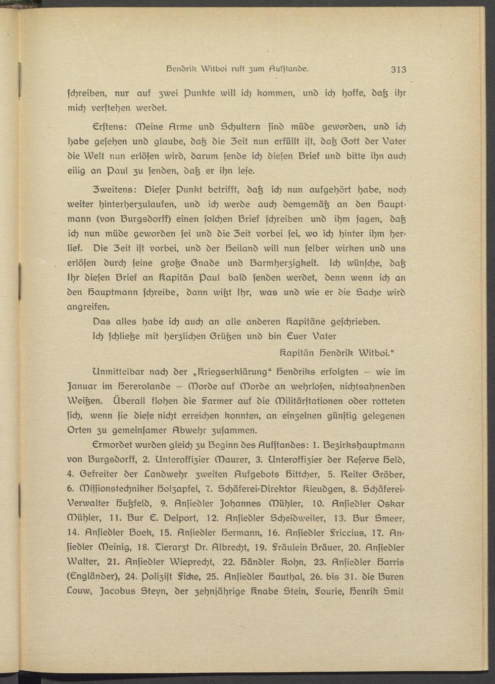 Ermordet wurden gleich zu Dsginn des Aukstandss: l. Dezirkshauptmann von IZurgsdorff, 2. Unteroffizier Maurer, 3. Unteroffizier der Reserve Leid, 4. Sskrsiter der Landwehr zweiten Aufgebots löittcher, 5. weiter Sröber, b. Missionstschniker löolzapfel, 7. Schäkerei-Direktor ^leudgen, 8. Schäkerei- Verwalter löutzkeld, d. Ansiedler Johannes Mühler, 10. Ansiedler Oskar Mühlsr, 11. Dur E. Delport, 12. Ansiedler Scheidweilsr, 13. Dur Lmeer, 14. Ansiedler Doek, 15. Ansiedler löermann, 1b. Ansiedler §riccius, 17. Ansiedler Msinig, 18. Eierarzt Dr. Albrecht, 19. §räulein Dräuer, 20. Ansiedler Walter, 21. Ansiedler Wieprecht, 22. Dändler I^ohn, 23. Ansiedler Darris (Engländer), 24. Polizist §icke, 25. Ansiedler Dauthal, 2b. bis 31. die Duren Louw, )acobus Ste^n, der zehnjährige ^nabe Stein, §ourie, Denrik Smit