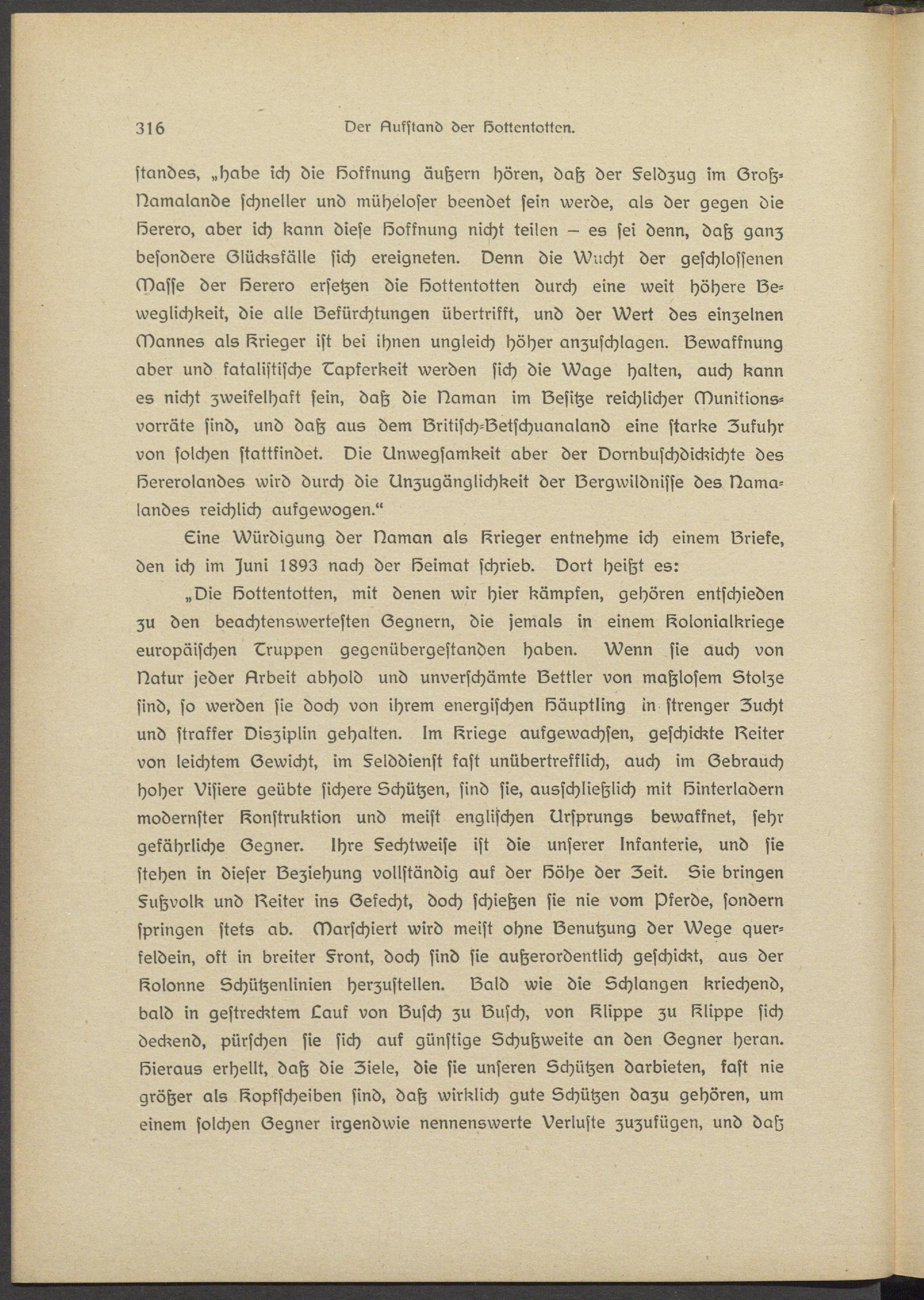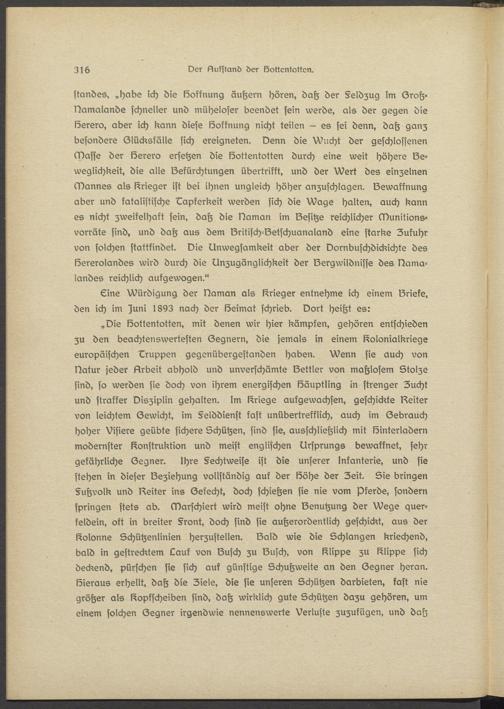 „Die Bottentotten, mit denen wir hier kämpfen, gehören entschieden zu den beachtenswertesten Gegnern, die jemals in einem Kolonialkriegs europäischen Lruppsn gegenübergestanden haben. Wenn sie auch von Batur jeder firbsit abhold und unverschämte Bettler von maßlosem Stolze sind, so werden sie doch von ihrem energischen Bäuptling in strenger Zucht und straffer Disziplin gehalten. Im Kriegs aufgewachsen, geschickte weiter von leichtem Gewicht, im §slddienst fast unübertrefflich, auch im Gebrauch hoher Visiere geübte sichere Schützen, sind sie, ausschließlich mit Binterladsrn modernster Konstruktion und meist englischen Ursprungs bewaffnet, sehr gefährliche Gegner. Ihre §schtweiss ist die unserer Infanterie, und sie stehen in dieser Beziehung vollständig auk der Böhs der Zeit. Sie bringen §ußvolk und Bsiter ins Gefecht, doch schießen sie nie vom Pferde, sondern springen stets ab. Marschiert wird meist ohne Benutzung der Wegs querfeldein, okt in breiter §ront, doch sind sie außerordentlich geschickt, aus der Kolonne Schützenlinien herzustellen. Bald wie die Schlangen kriechend, bald in gestrecktem Lauf von Busch zu Busch, von Klippe zu Klippe sich deckend, pürschen sie sich auf günstige Schußweite an den Gegner heran. Bisraus erhellt, daß die Ziels, die sie unseren Schützen darbieten, fast nie größer als kopfschsibsn sind, daß wirklich gute Schützen dazu gehören, um einem solchen Gegner irgendwie nennenswerte Verluste zuzufügen, und daß