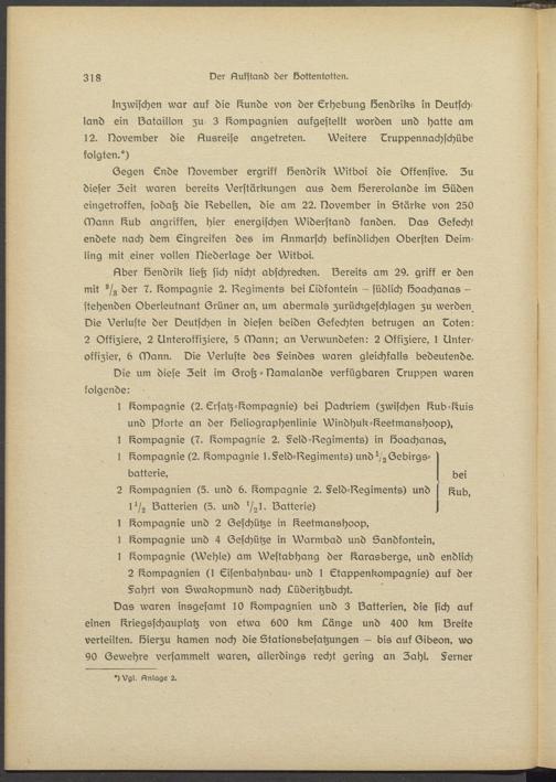 Segen Ende November ergriff Bendrik Witboi die Offensive. Zu dieser Zeit waren bereits Verstärkungen aus dem lösrsrolande im Süden eingetroffen, sodah die Nebelten, die am 22. November in Stärke von 250 Mann l^ub angriffen, hier energischen Widerstand fanden. Das Sekecht endete nach dem Eingreifen des im Nnmarsch befindlichen Obersten Deim- ling mit einer vollen Niederlage der Witboi.