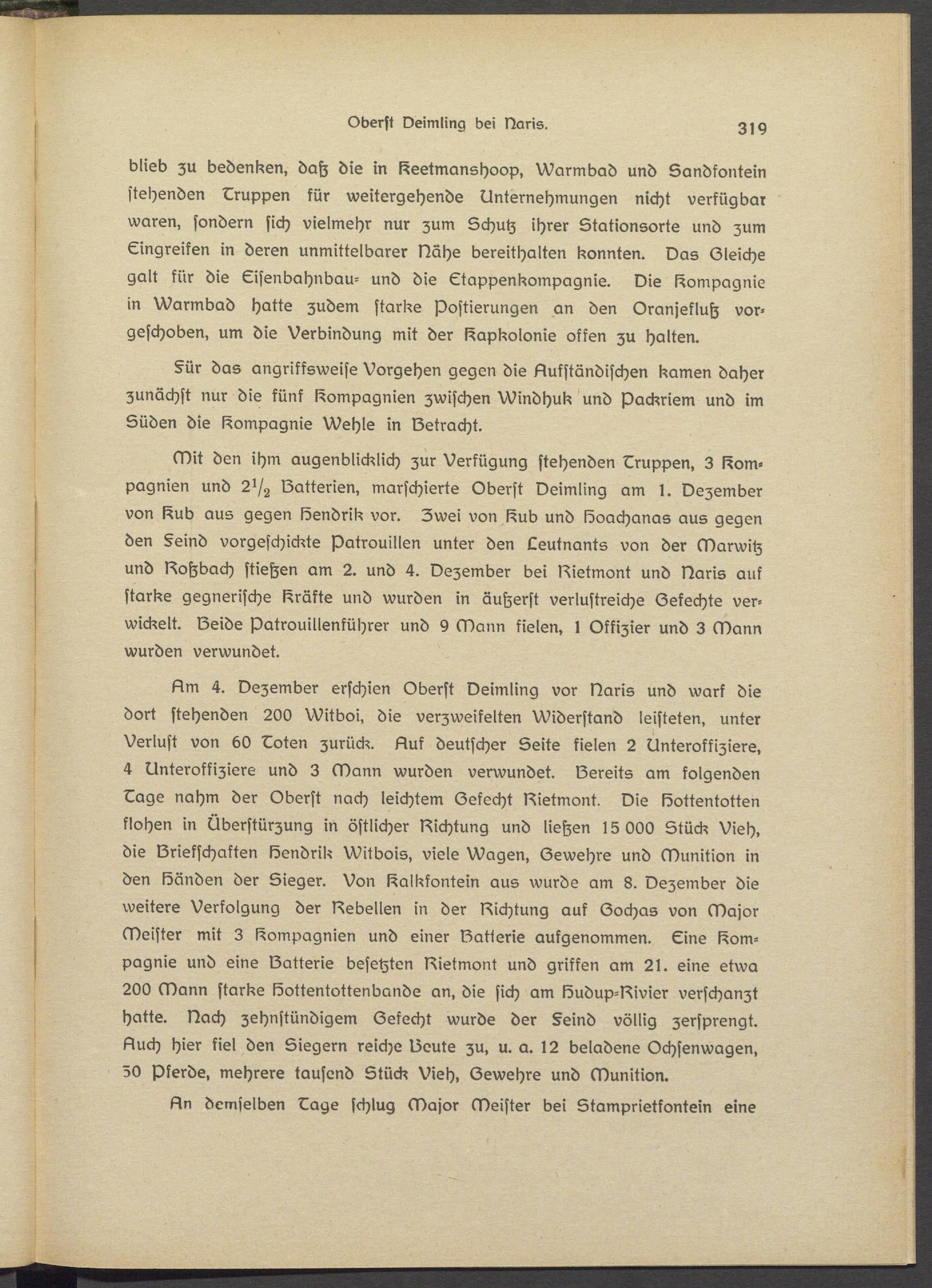 Am 4. Dezember erschien Oberst Dsimling vor Daris und warf die dort stehenden 200 Witboi, die verzweifelten Widerstand leisteten, unter Verlust von 60 Lotsn zurück. Auf deutscher Seite kielen 2 Unteroffiziers, 4 Unteroffiziere und 3 Mann wurden verwundet. IZereits am folgenden Lage nahm der Oberst nach leichtem Gefecht Aietmont. Die Sottentotten flohen in Überstürzung in östlicher Dichtung und ließen 15 000 Stück Vieh, die Sriefschakten löendrik Witbois, viele Wagen, Gewehre und Munition in den löänden der Sieger. Von l^alkkontein aus wurde am 8. Dezember die weitere Verfolgung der Asbesten in der Dichtung auf Gochas von Major Meister mit 3 Compagnien und einer Datierte aufgenommen. Eine Compagnie und eine Datteris besetzten Distmont und griffen am 21. eins etwa 200 Mann starke löottentottenbande an, die sich am Sudup-Divier verschanzt hatte. Dach zehnstündigem Gefecht wurde der §eind völlig zersprengt. Auch hier fiel den Siegern reiche Deute zu, u. a. 12 beladene Ochsenwagen, 50 Pferde, mehrere tausend Stück Vieh, Gewehre und Munition.