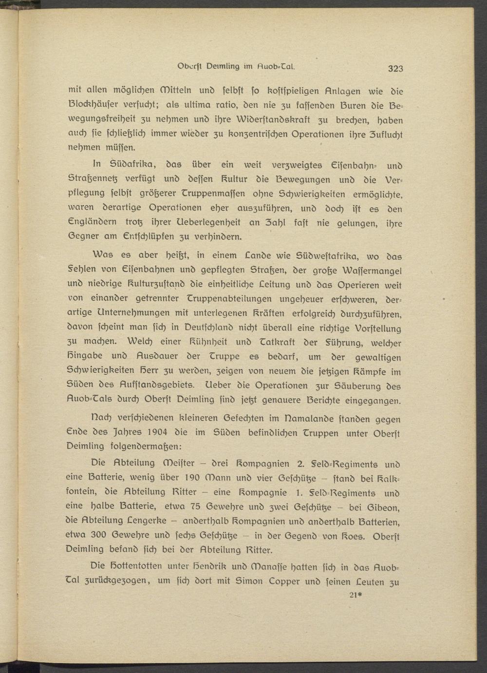 Was es aber heißt, in einem Lande wie Südwestafrika, wo das §ehlen von Eisenbahnen und gepflegten Straßen, der große Wassermangel und niedrige l^ulturzustand die einheitliche Leitung und das Operieren weit von einander getrennter Eruppenabteilungsn ungeheuer erschweren, derartige Unternehmungen mit unterlegenen Trakten erfolgreich durchzuführen, davon scheint man sich in Deutschland nicht überall eine richtige Vorstellung zu machen. Welch einer Kühnheit und Eatkrakt der §ührung, welcher Bingabe und Ausdauer der Eruppe es bedarf, um der gewaltigen Schwierigkeiten löerr zu werden, zeigen von neuem die jetzigen dämpfe im Süden des Aufstandsgebiets. Ueber die Operationen zur Säuberung des Auob-Eals durch Oberst Dsimling sind jetzt genauere Berichte eingegangen.