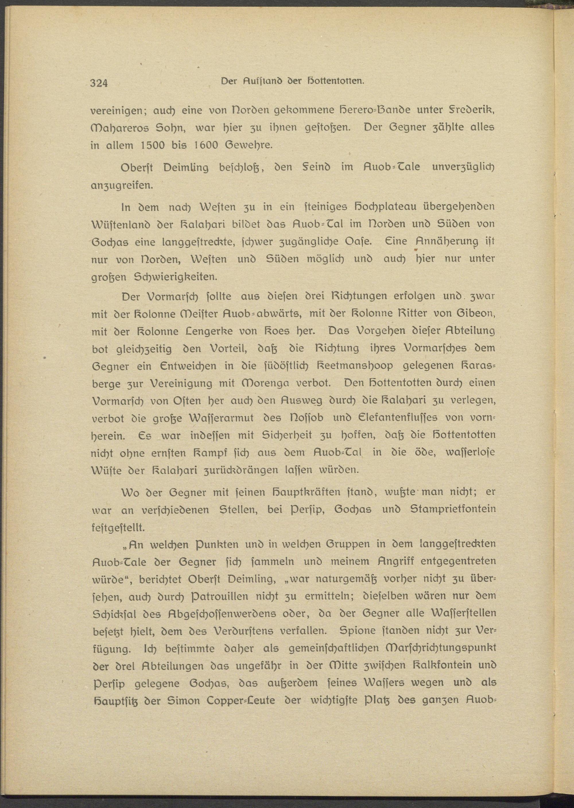 „An welchen Punkten und in welchen Gruppen in dem langgestreckten Auob-Eals der Gegner sich sammeln und meinem Angriff entgegentreten würde", berichtet Oberst veimling, „war naturgemäß vorher nicht zu übersehen, auch durch Patrouillen nicht zu ermitteln; dieselben wären nur dem Schicksal des Abgeschossenwerdsns oder, da der Gegner alle Wasserstellen besetzt hielt, dem des Verdurstens verfallen. Spione standen nicht zur Verfügung. Ich bestimmte daher als gemeinschaftlichen Marschrichtungspunkt der drei Abteilungen das ungefähr in der Mitte zwischen l^alkkontein und Persip gelegene Gochas, das außerdem seines Wassers wegen und als Sauptsitz der Simon Lopper-Lsute der wichtigste Platz des ganzen Auob-