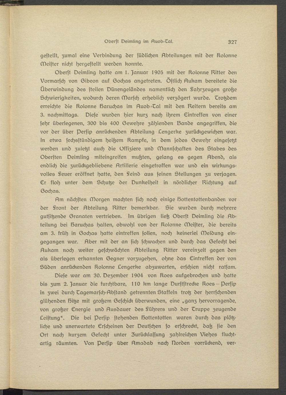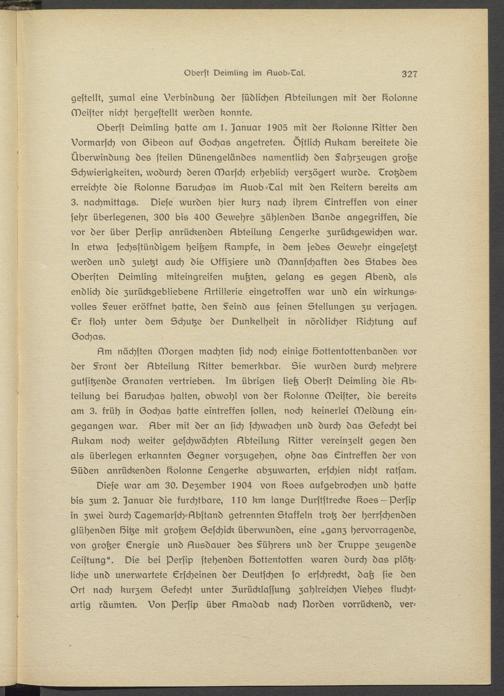 Am nächsten Morgen machten sich noch einige löottsntottenbanden vor der §ront der Abteilung Sitter bemerkbar. Sie wurden durch mehrere gutsitzende Oranatsn vertrieben. Im übrigen lietz Oberst Deimling die Abteilung bei löaruchas halten, obwohl von der Kolonne Meister, die bereits am 3. früh in Oochas hatte eintreffen sollen, noch keinerlei Meldung eingegangen war. Aber mit der an sich schwachen und durch das Oekecht bei Ankam noch weiter geschwächten Abteilung Sitter vereinzelt gegen den als überlegen erkannten Oegner vorzugehen, ohne das Eintreffen der von Süden anrückenden Kolonne Lengsrke abzuwarten, erschien nicht ratsam.
