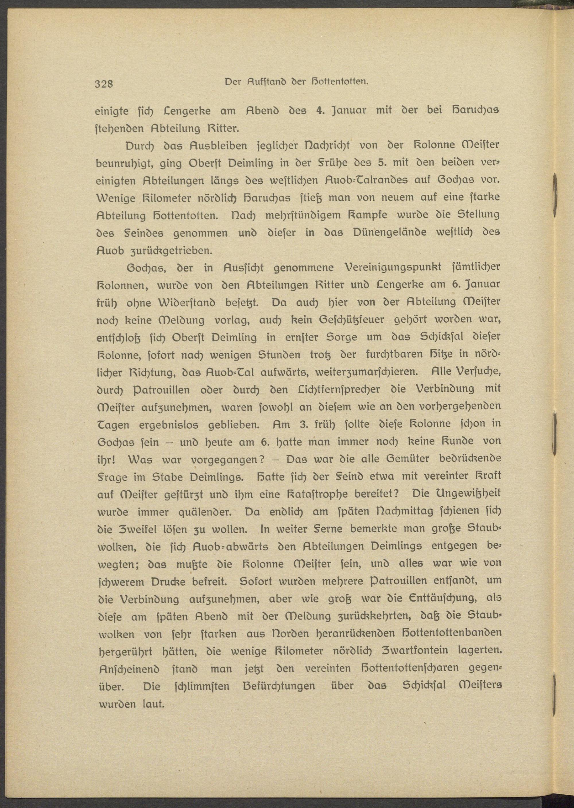 Durch das Ausbleiben jeglicher Dachricht von der Kolonne Meister beunruhigt, ging Oberst Deimling in der Trühe des 5. mit den beiden vereinigten Abteilungen längs des westlichen Auob-Lalrandes auk Oochas vor. Wenige Kilometer nördlich Saruchas stieß man von neuem auf eine starke Abteilung Sottentotten. Dach mehrstündigem dampfe wurde die Stellung des Teindes genommen und dieser in das Dünsngelände westlich des Auob zurückgetrieben.