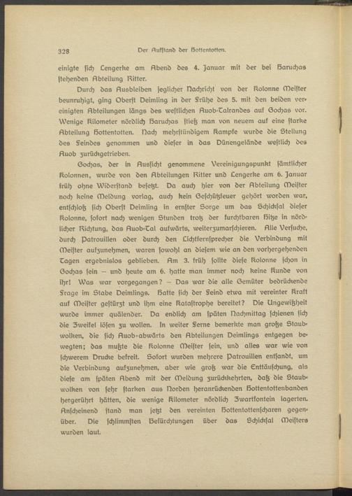 Oochas, der in Aussicht genommene Vereinigungspunkt sämtlicher Kolonnen, wurde von den Abteilungen Aitter und Lengsrke am b. Januar früh ohne Widerstand besetzt. Da auch hier von der Abteilung Meister noch keine Meldung vorlag, auch kein Oeschützksusr gehört worden war, entschloß sich Oberst Deimling in ernster Sorge um das Schicksal dieser Kolonne, sofort nach wenigen Stunden trotz der furchtbaren Sitze in nördlicher Aichtung, das Auob-Lal aufwärts, weiterzumarschisrsn. Alle Versuchs, durch Patrouillen oder durch den Lichtfsrnsprschsr die Verbindung mit Meister aufzunehmen, waren sowohl an diesem wie an den vorhergehenden Lagen ergebnislos geblieben. Am 3. früh sollte diese Kolonne schon in Oochas sein - und heute am 6. hatte man immer noch keine Kunde von ihr! Was war vorgegangen? - Das war die alle Gemüter bedrückende Trage im Stabs Deimlings. Satte sich der Teind etwa mit vereinter Kraft auk Meister gestürzt und ihm eins Katastrophe bereitet? Die Ungewißheit wurde immer quälender. Da endlich am späten Dachmittag schienen sich die Zweifel lösen zu wollen, in weiter Tsrns bemerkte man große Staubwolken, die sich Auob-abwärts den Abteilungen Deimlings entgegen bewegten; das mußte die Kolonne Meister sein, und alles war wie von schwerem Drucke befreit. Sofort wurden mehrere Patrouillen entsandt, um die Verbindung aufzunehmen, aber wie groß war die Enttäuschung, als diese am späten Abend mit der Meldung zurückkehrten, daß die Staubwolken von sehr starken aus Dorden heranrückenden Sottentottenbanden hergerührt hätten, die wenige Kilometer nördlich Zwartkontein lagerten. Anscheinend stand man jetzt den vereinten Sottentottenscharen gegenüber. Die schlimmsten Sekürchtungsn über das Schicksal Meisters wurden laut.