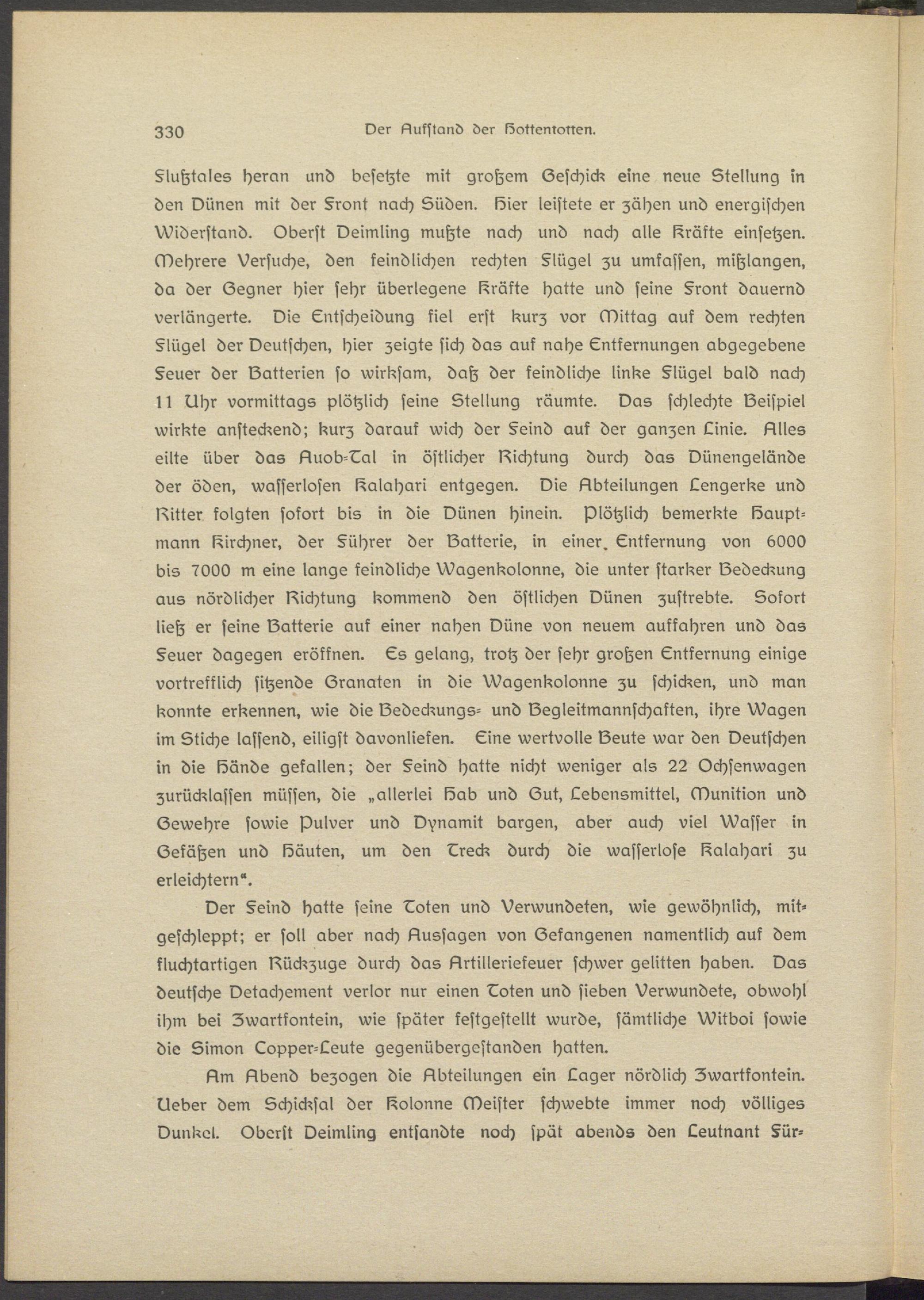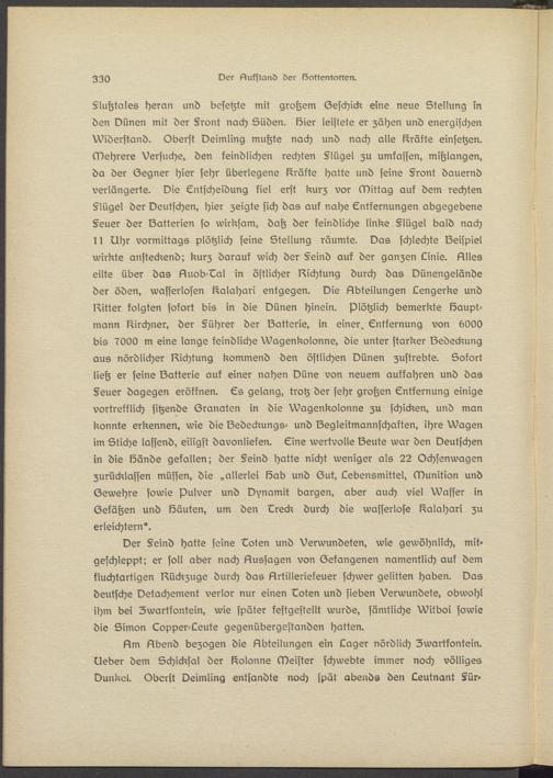 §lußtales heran und besetzte mit großem Geschick eine neue Stellung in den Dünen mit der §ront nach Süden, Lier leistete er zähen und energischen Widerstand. Oberst Deimling mutzte nach und nach alle Tratte einsetzen. Mehrere Versuchs, den feindlichen rechten §Iügsl zu umfassen, mißlangen, da der Gegner hier sehr überlegene Kräfte hatte und seine §ront dauernd verlängerte. Die Entscheidung kiel erst kurz vor Mittag auf dem rechten §lügel der Deutschen, hier zeigte sich das auf nahe Entfernungen abgegebene §eusr der Lattsrien so wirksam, daß der feindliche linke §lügel bald nach 11 Uhr vormittags plötzlich seine Stellung räumte. Das schlechte IZeispisI wirkte ansteckend; kurz darauf wich der §eind auf der ganzen Linie. Lllles eilte über das Lluob-Dal in östlicher Dichtung durch das Dünengslände der öden, wasserlosen ßalahari entgegen. Die Abteilungen Lsngsrke und Imitier folgten sofort bis in die Dünen hinein, plötzlich bemerkte Laupt- mann Kirchner, der §ührer der Lotterie, in einer. Entfernung von bOOO bis 7000 m eine lange feindliche Wagenkolonne, die unter starker Ledeckung aus nördlicher Lichtung kommend den östlichen Dünen zustrebte. Sofort ließ er seine Lotterie auf einer nahen Düne von neuem auffahren und das §euer dagegen eröffnen. Es gelang, trotz der sehr großen Entfernung einige vortrefflich sitzende Granaten in die Wagenkolonne zu schicken, und man konnte erkennen, wie die Ledeckungs- und Legleitmannschakten, ihre Wagen im Stichs lassend, eiligst davonliefen. Eine wertvolle Leute war den Deutschen in die Lände gefallen; der §sind hatte nicht weniger als 22 Ochssnwagsn zurücklassen müssen, die „allerlei Lab und Gut, Lebensrnittel, Munition und Gewehre sowie Pulver und Dynamit bargen, aber auch viel Wasser in Gekätzsn und Läuten, um den Dreck durch die wasserloss ßalahari zu erleichtern".