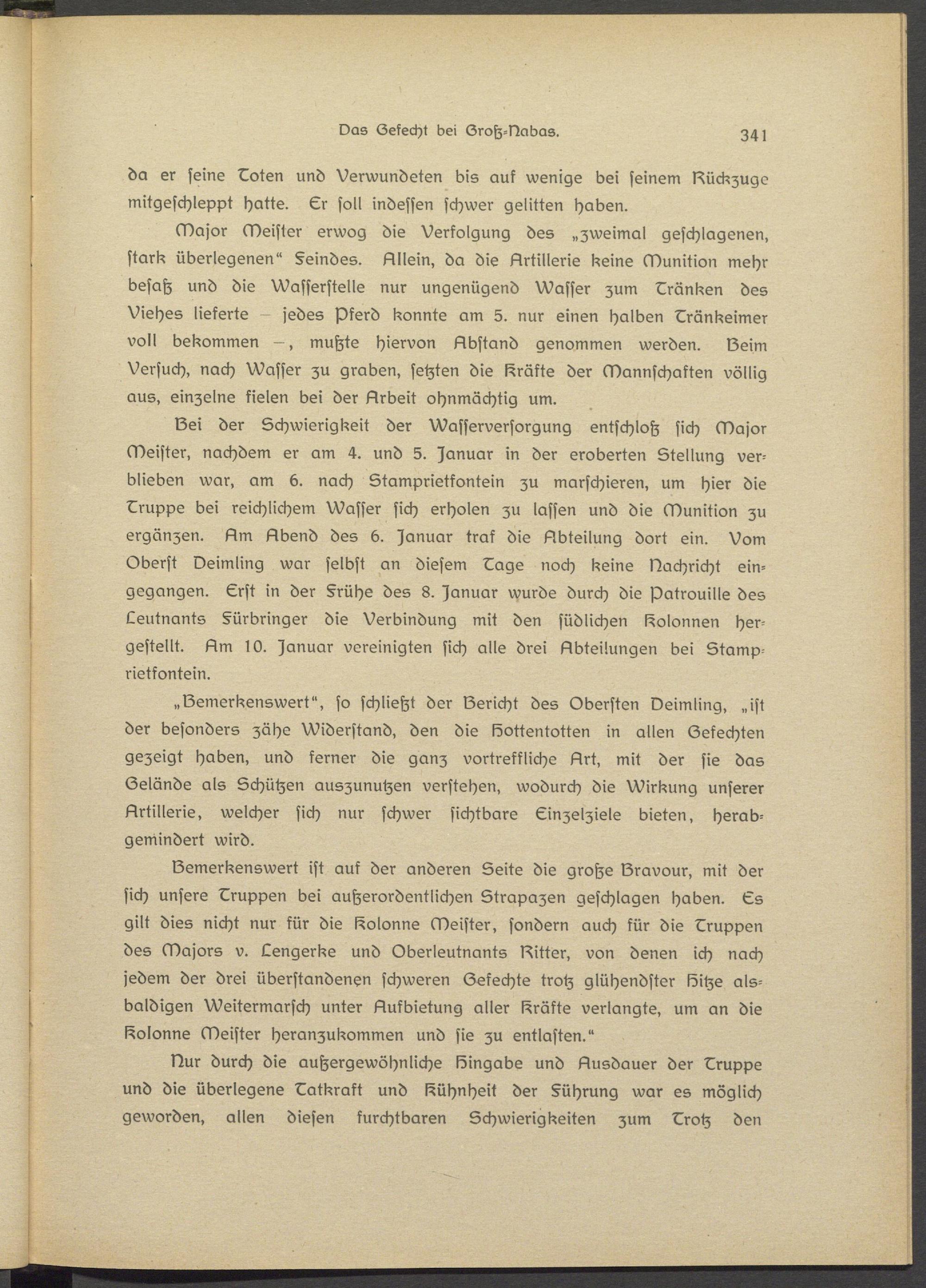„Gemsrkenswert", so schließt der Gericht des Obersten vsimling, „ist der besonders zähe Widerstand, den die löottentottsn in allen Gefechten gezeigt haben, und ferner die ganz vortreffliche Art, mit der sie das Gelände als Schützen auszunutzen verstehen, wodurch die Wirkung unserer Artillerie, welcher sich nur schwer sichtbare Ginzslzisls bieten, herabgemindert wird.