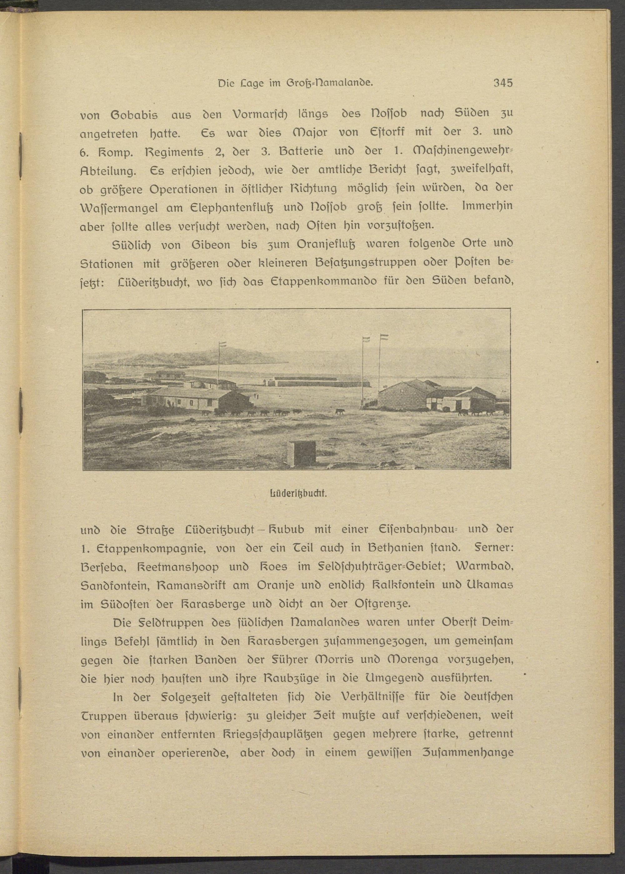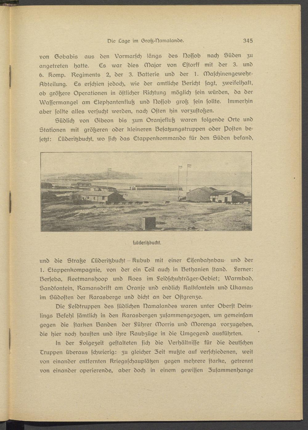 Südlich von (Zibson bis zum Oranjsflutz waren folgende Orts und Stationen mit größeren oder kleineren Besatzung struppen oder Posten besetzt: Lüderitzbucht, wo sich das Ctappsnkommando kür den Süden befand,